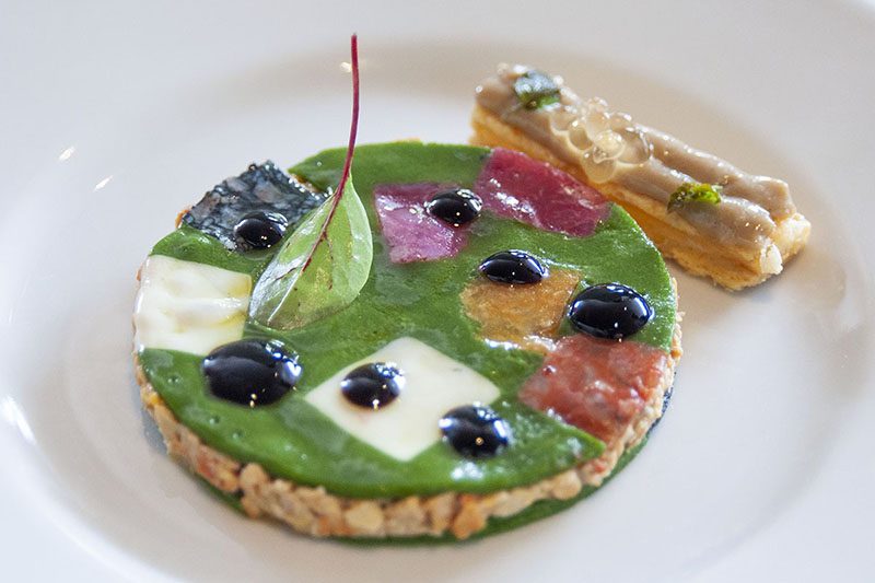 Si tratta di un disco di scarola ripassata in padella alla napoletana, con acciughina e cappero, realizzata come una fetta di mortadella ma con cubetti di ricciola colorata in infusione di estratti. All’interno del disco, un mantecato di ricciola con i suoi fegatini e per completare, le gocce di aceto di fichi sferificati di De Nigris. In accompagnamento una millefoglie con il patè di fegatini, per una proposta che si.. bissa! Nel piatto anche la ricotta di bufala ed i pomodori secchi.