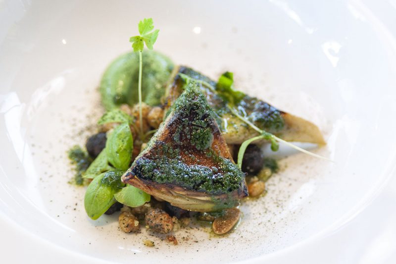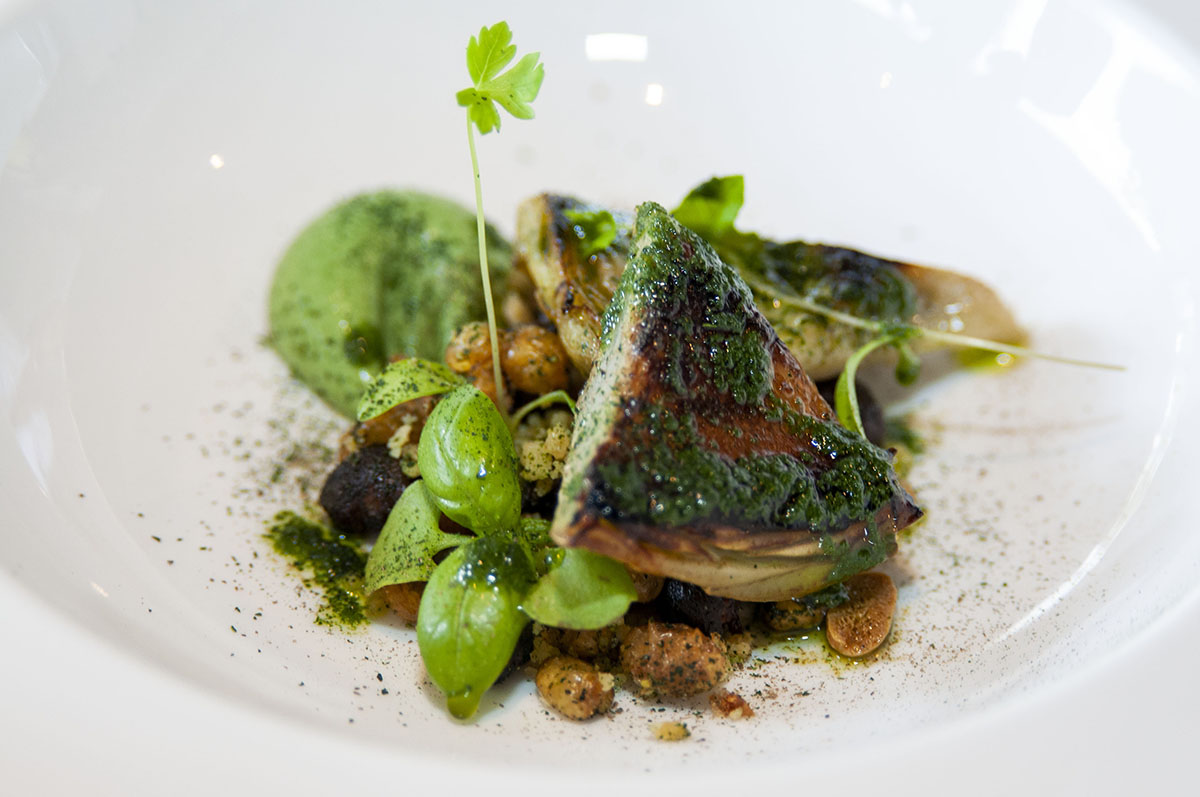 C’è la croccantezza dei legumi e dei cereali ed il carciofo, quello bianco di Pertosa arrostito, a prevalere nel piatto. In accompagnamento la maionese alla menta, ottenuta con i fagioli di soia ed il latte di mozzarella, capace di donare al piatto la parte grassa che senza di essa, sarebbe mancata.