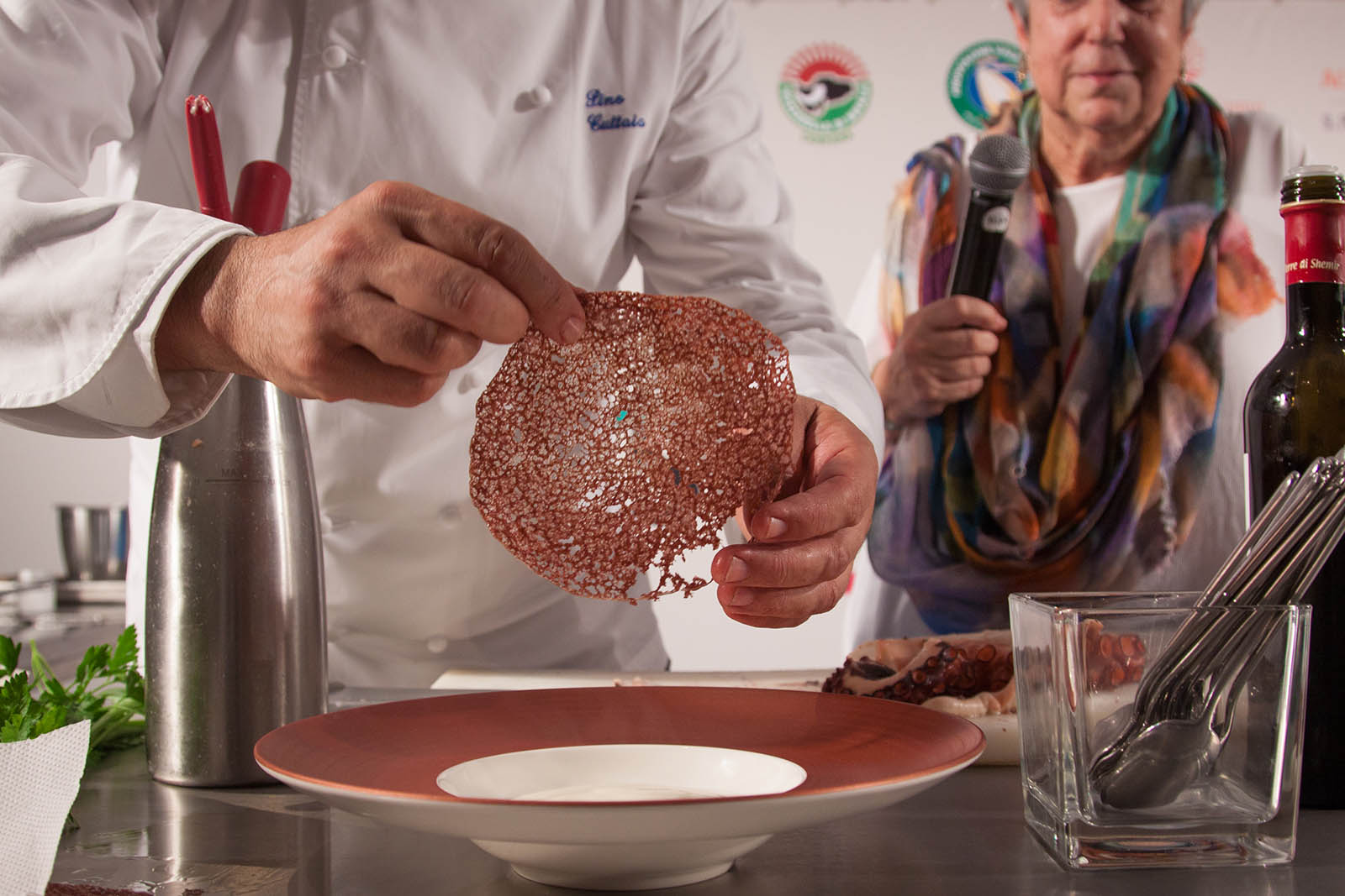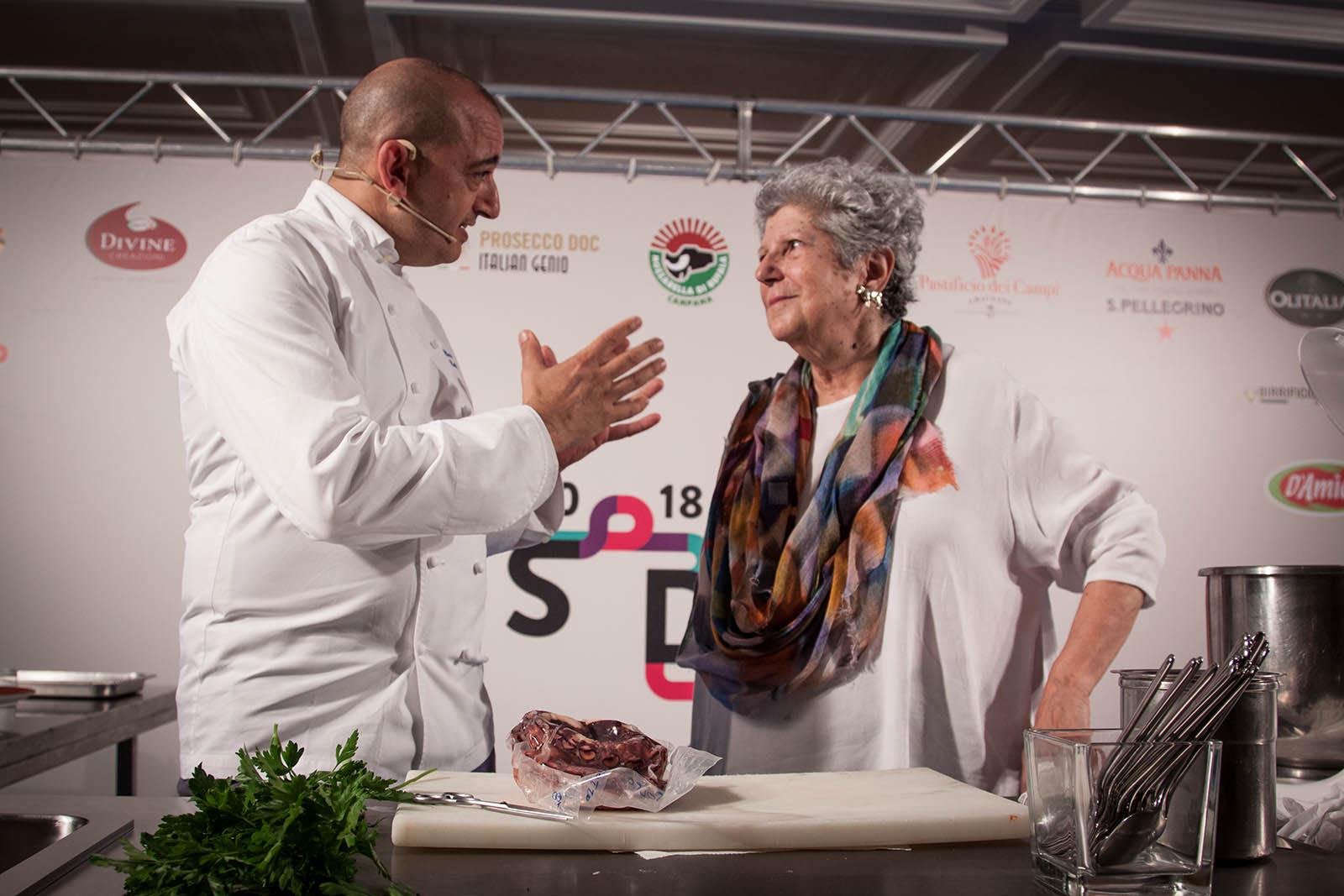 Presentato da Faith Willinger – una delle prime a scrivere di lui, e a parlarne ad Albert Sapere – lo chef de La Madia presenta al congresso non solo due piatti ma una sua riflessione più ampia sulla sua crescita ed evoluzione personale e professionale e in generale su come cambia la visione della cucina mano a mano che avanza l’età del cuoco: “A 30 anni aggiungi, fai casino per far vedere quanto sei bravo. A 50, invece, capisci che basta un gesto a raccontare qualcosa”.