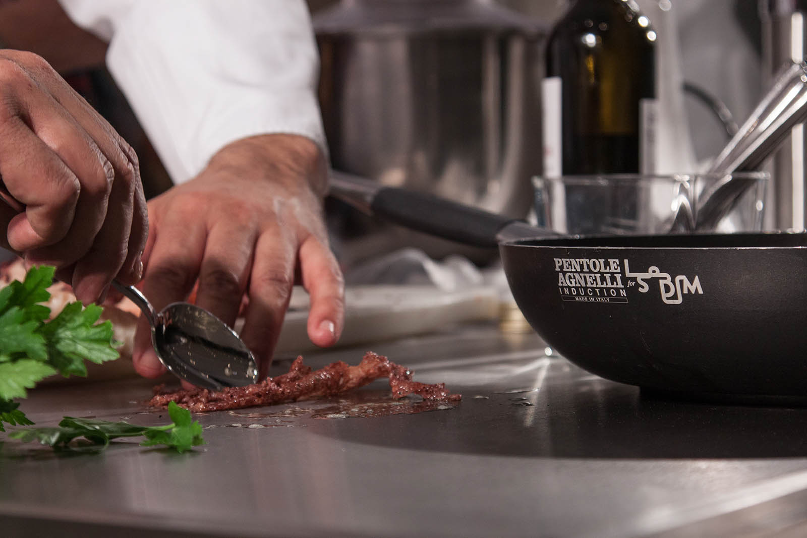 Usa i loro attrezzi – a cominciare dalle forbici da barbiere, che hanno un taglio perfetto – e va fare spesa di utensili dal ferramenta. Per Pino Cuttaia, il nesso tra cuoco e artigiano è indissolubile: “In entrambi i casi, mettiamo a disposizione il nostro sapere e lo doniamo agli altri”.