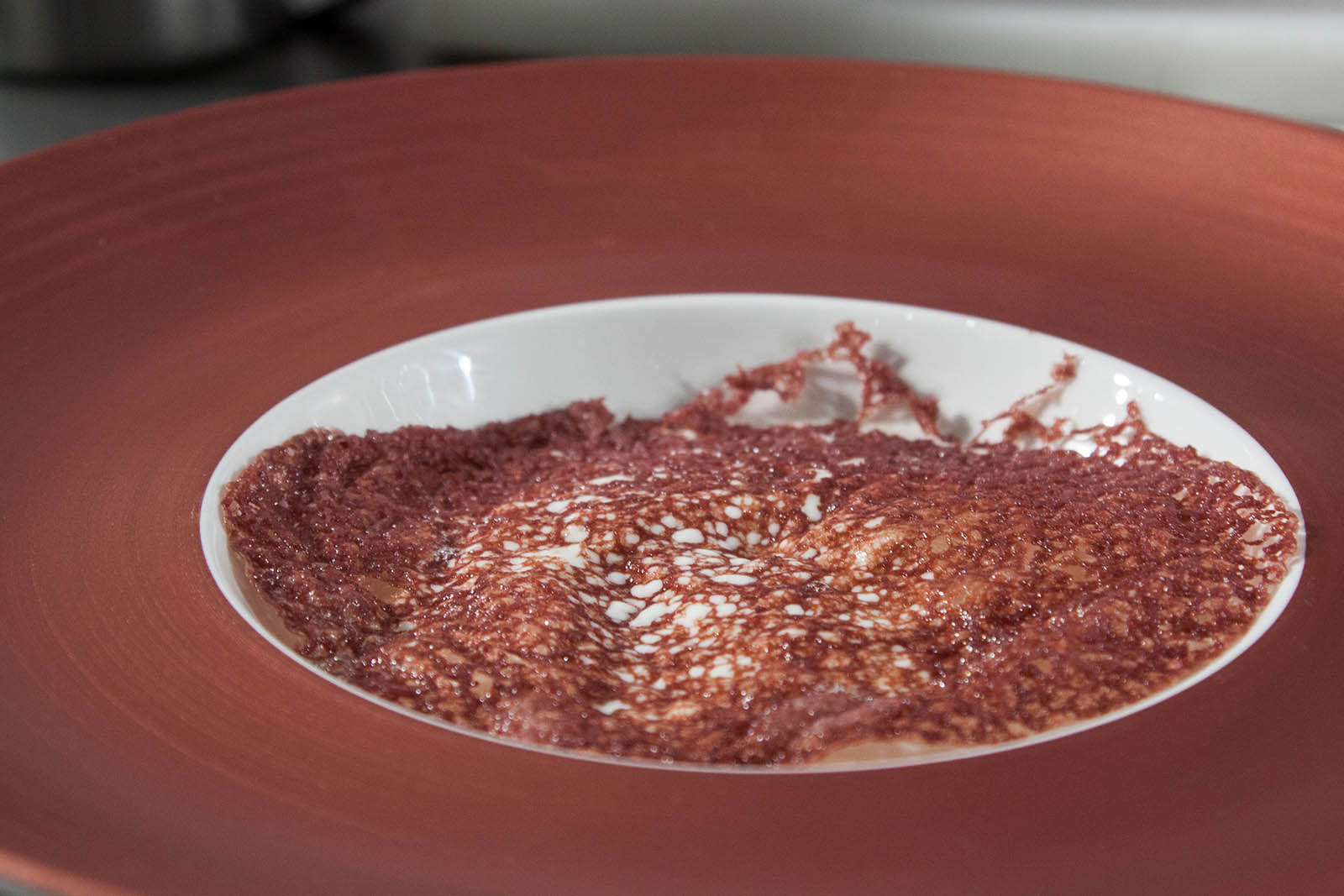 Cuttaia ne ottiene una sorta di maionese con cui – semplicemente spalmandone uno strato sottile in una padella rovente – ottiene una cialda sottile e croccante che ne sprigiona tutto il profumo. La cialda va a coprire gli strati di polpo tagliato a rondelle e spuma di patate fatta con panna di bufala, rompendola poi col cucchiaio come se fosse la crosta di una crema bruciata, in un piatto essenziale ma perfetto. Non serve nemmeno aggiungere sale: “Basta il gusto dell’acqua marina che porta con sé il polpo”, spiega lo chef.