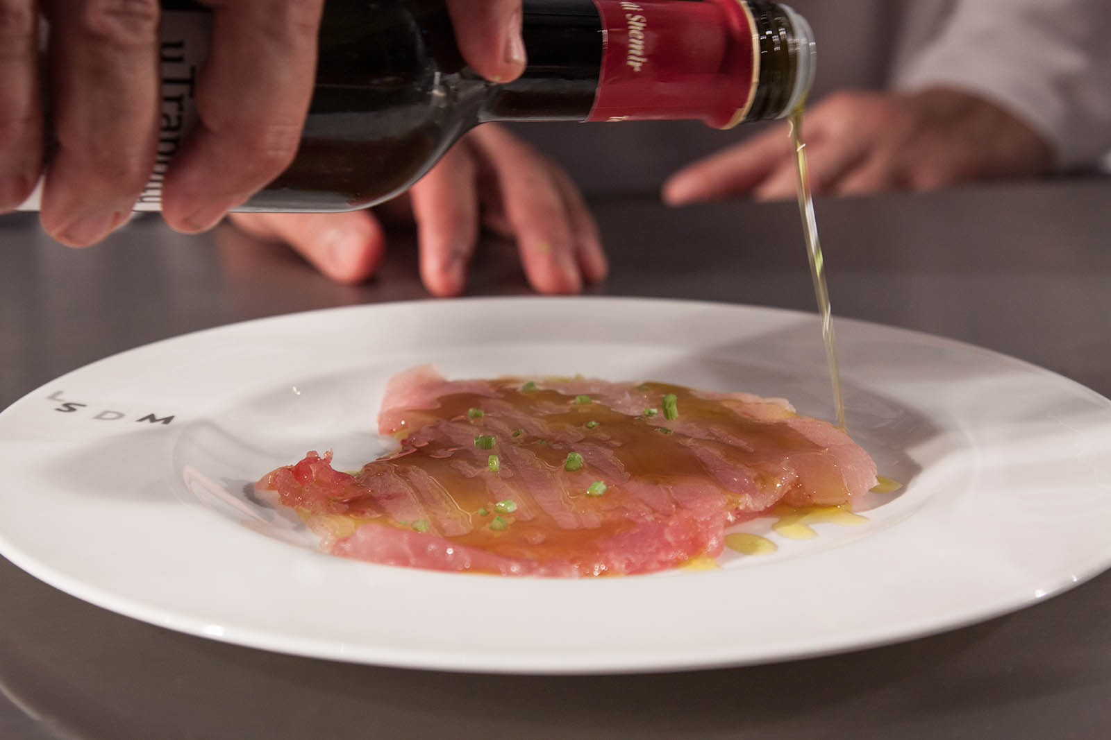 Ne è esempio un suo piatto ormai già noto, che ha ribattezzato memoria visiva e che prende spunto dalla “perfezione dell’imperfezione domestica”, dai gesti di affetto di una mamma che nella povertà del Dopoguerra preparava per il figlio malato la “fettina” di carne a bagnomaria con il limone, senza curarsi troppo di levarne un seme rimasto. Lui la rivede con una fetta cruda di Alalunga – pesce ottimo e sostenibile – con olio extravergine e limone, con tanto di seme lasciato lì al centro a ricordare il gesto da cui nasce. Ma pure la sua crème brûlée di pelle di polpo, risultato del suo studio sul recupero – intelligente e goloso – delle pelli degli animali, solitamente considerate scarto. Quella del polpo, cotto tradizionalmente e poi privato meticolosamente della sua guaina ricca di proteine e gelificanti, viene frullata e poi montata in planetaria aggiungendo olio extravergine siciliano a filo.