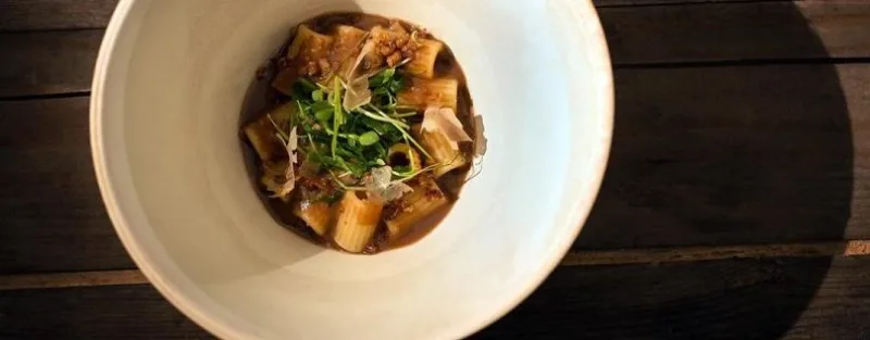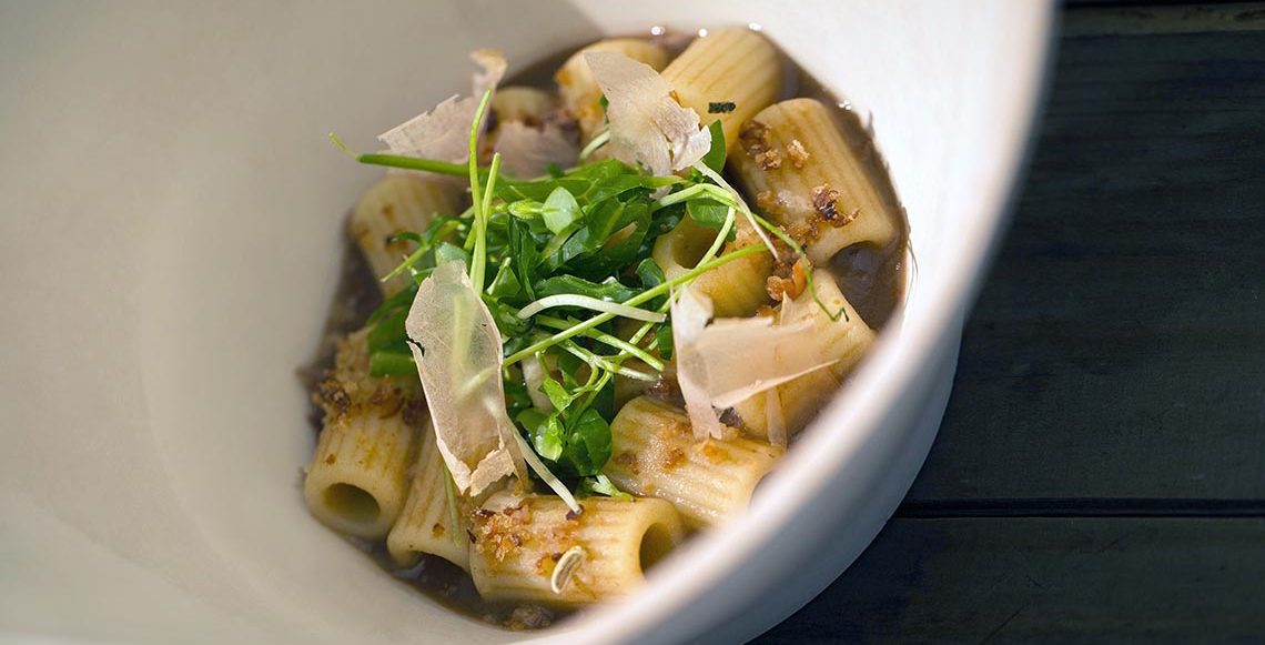 Lo chef, per l’occasione, ha deciso di abbinare i tubetti del Pastificio dei Campi al Fagiolo Merulla, legume che cresce in Sila ed è così chiamato per la presenza di una leggera venatura sulla parte esterna che, intrecciandosi, ricorda il cervello, detto appunto “merulla” in dialetto; durante la cottura, avendo una pelle poco coriacea, tende a rompersi e a creare una crema di fagioli senza l’ausilio di frullatori.