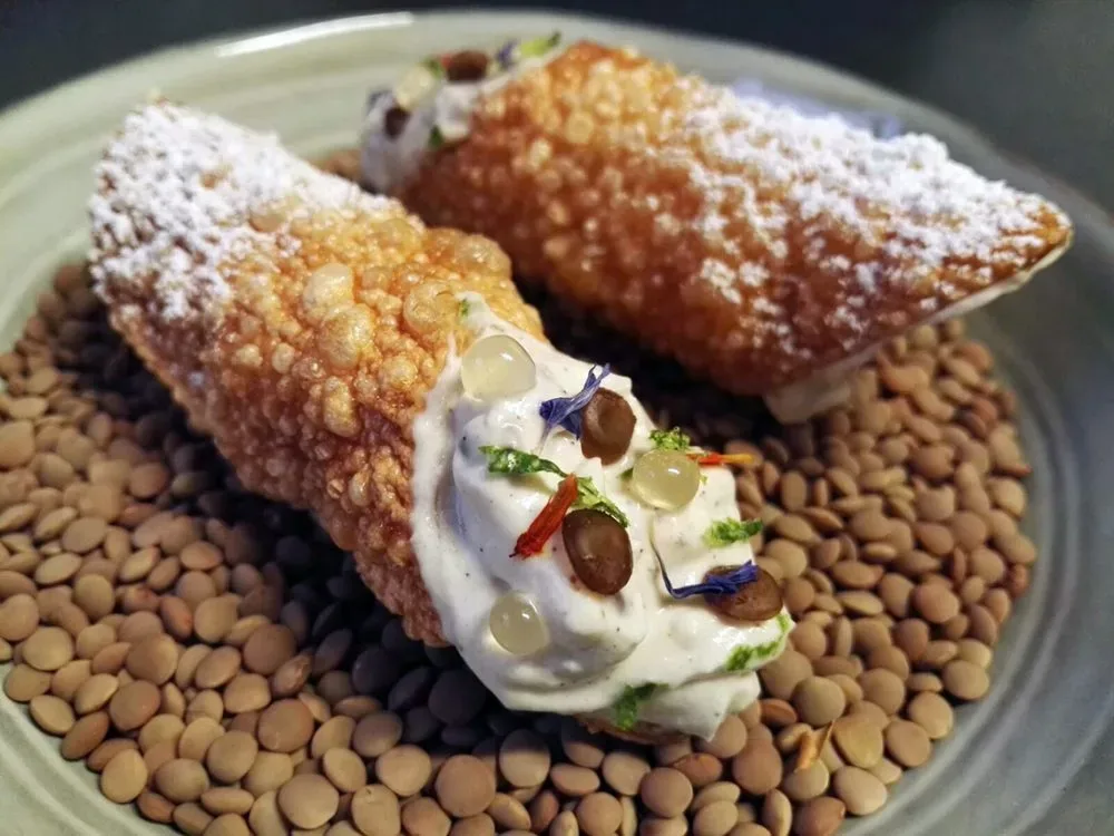 Mettere all’interno di una ciotola/piatto da servizio delle lenticchie secche che saranno la base su cui disporre i “cannoli di pasta”. Farcire i bombardoni con la ricotta aromatizzata al caffè, perle di miele al tartufo, lenticchie al caffè e lime. Su un lato del bombardone porre delle lenticchie, delle perle di miele, fiori eduli essiccati e scorza di lime come decorazioni; dall’altra ricoprire la ricotta completamente di lenticchie come a simulare delle gocce di cioccolata tipiche dei cannoli. Spolverare con lo zucchero vanigliato metà dei bombardoni e servire.