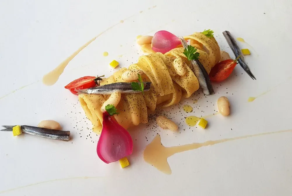 Dopo aver mantecato bene la pasta, avvolgere le fettucce con una pinza e posizionare su una mattonella bianca, impiattando trasversalmente. Adagiare le alici fatte marinare in precedenza dal lato della pelle, i pomodori del Piennolo confit, qualche fetta di cipolla sfogliata, qualche fagiolo intero, qualche fogliolina di prezzemolo.