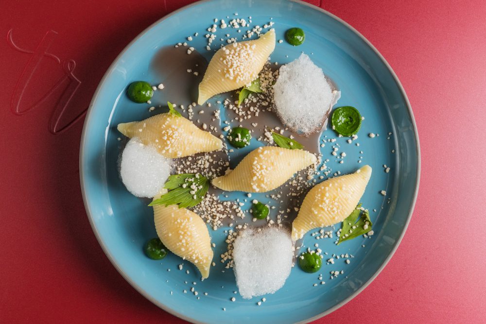 Lessare la pasta per 16 minuti in abbondante acqua salata. Scolare e farcire con la crema di fagioli. Versare 3-4 cucchiai di acqua di fagioli sulla base del piatto, adagiarvi i conchiglioni ripieni, fare dei puntini con la salsa di prezzemolo e aglio, adagiare sul piatto l’aria di rosmarino, le foglie di levistico e, poco prima di servire il piatto, la granita di guanciale.