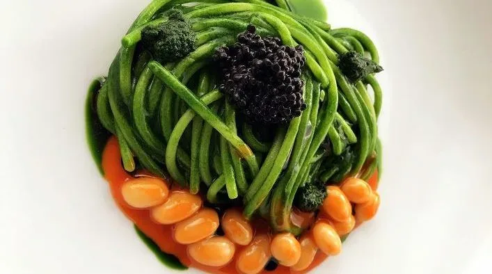 Adagiare i fagioli sul fondo del piatto, poi gli spaghetti, il caviale d’aringa, due punti di crema di cavolo nero, il suo olio e una grattata di scorza di limone.