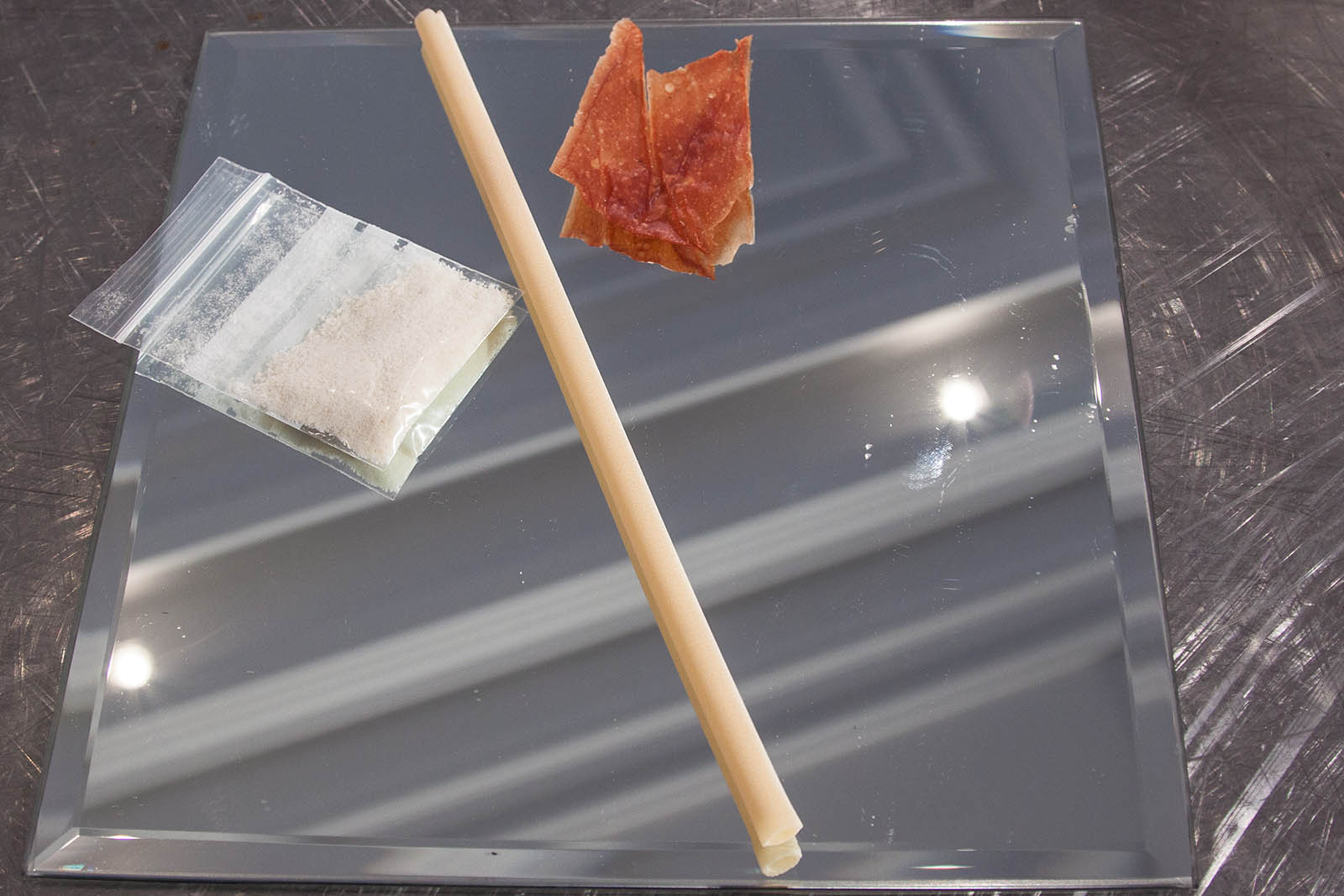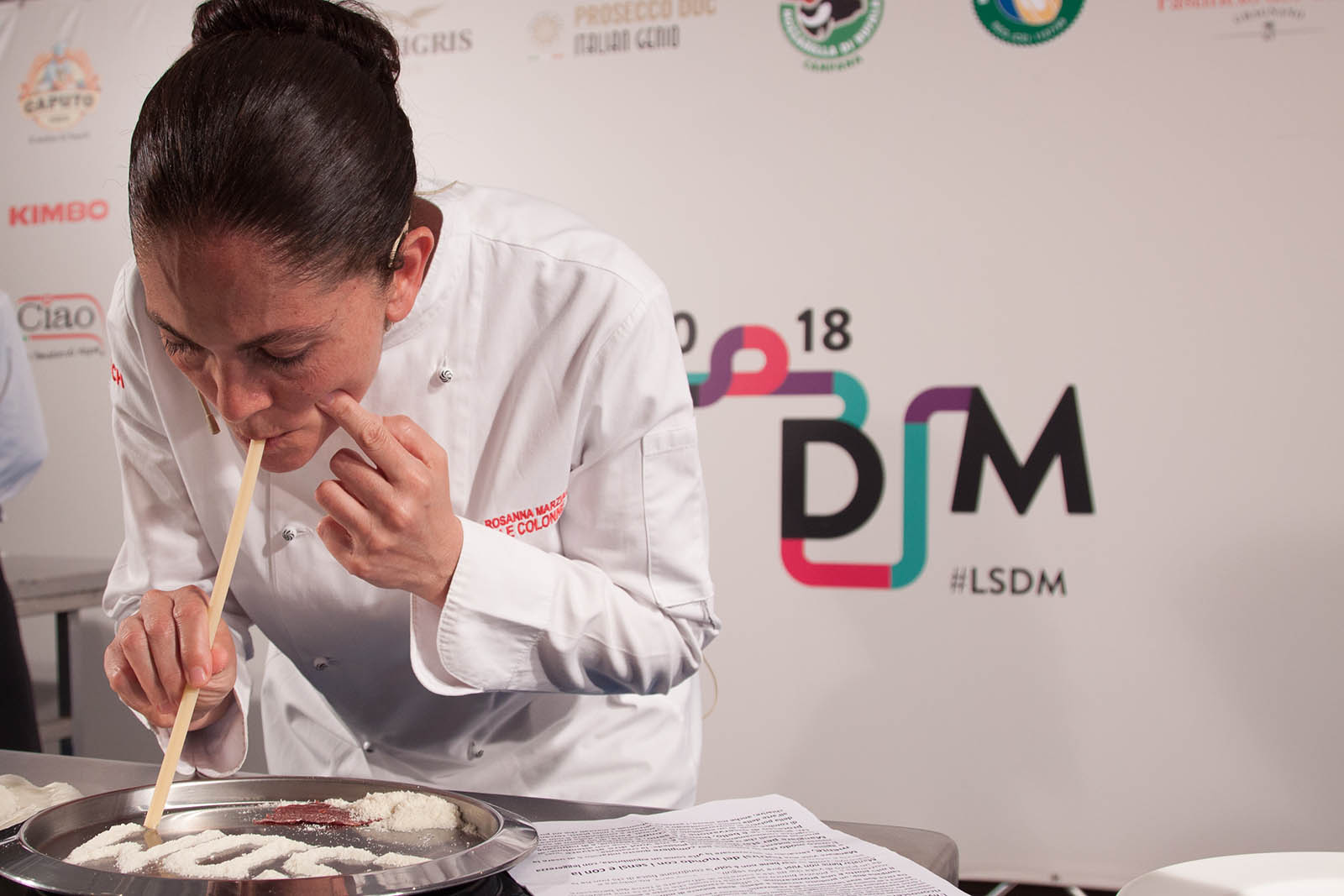Lei, prendendo spunto dalla ben nota “polvere bianca” che viene scelta da alcuni come presunto rimedio per superare le emozioni quotidiane di difficile gestione – quel mix di paura, noia, angoscia che tutti noi prima o poi sperimentiamo – la presenta al congresso in bustine, con tanto di piatto-specchio, cialda di pomodoro con cui preparare le strisce e una lunga candela di Gragnano con cui tirarla su (in questo caso, con la bocca e non con il naso).