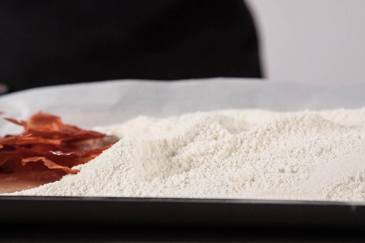 Così, lei questa volta dalla mozzarella (frullata con xantana e farina di riso, passata ed essiccata lentamente in forno fino a farla asciugare) ricava una polvere piuttosto secca ma intensa che può diventare ingrediente per tanti piatti e si presta a diversi usi gastronomici non per sostituire la mozzarella ma magari per esaltarne il sapore o per aggiungere una texture.