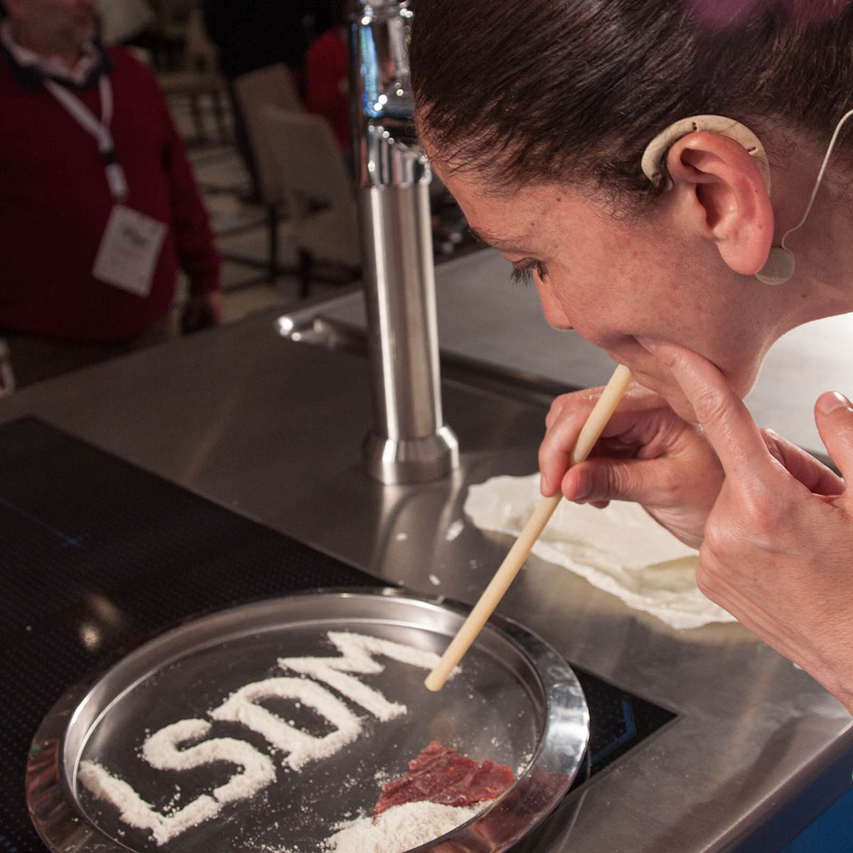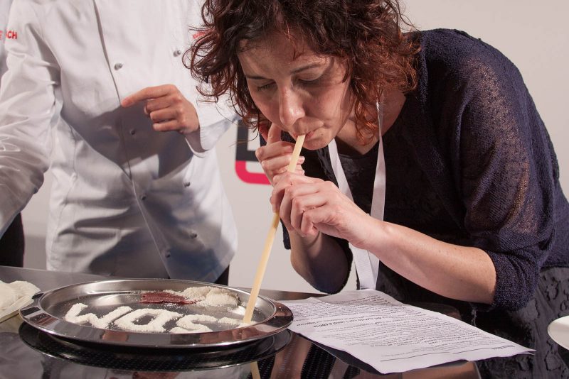 Lei, prendendo spunto dalla ben nota “polvere bianca” che viene scelta da alcuni come presunto rimedio per superare le emozioni quotidiane di difficile gestione – quel mix di paura, noia, angoscia che tutti noi prima o poi sperimentiamo – la presenta al congresso in bustine, con tanto di piatto-specchio, cialda di pomodoro con cui preparare le strisce e una lunga candela di Gragnano con cui tirarla su (in questo caso, con la bocca e non con il naso).