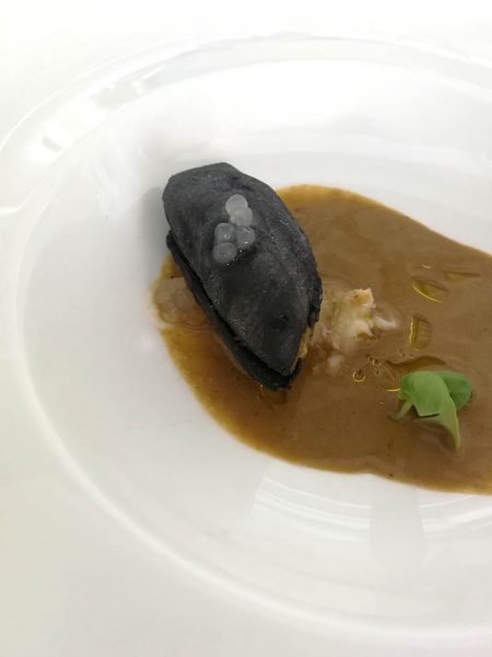 Il “Ricordo di una impepata di cozze con cialda croccante, ripieno di baccalà ed aceto De Nigris”, un gioco giustificato in partenza dalla distanza, che poi ha preso una strada tutta sua.