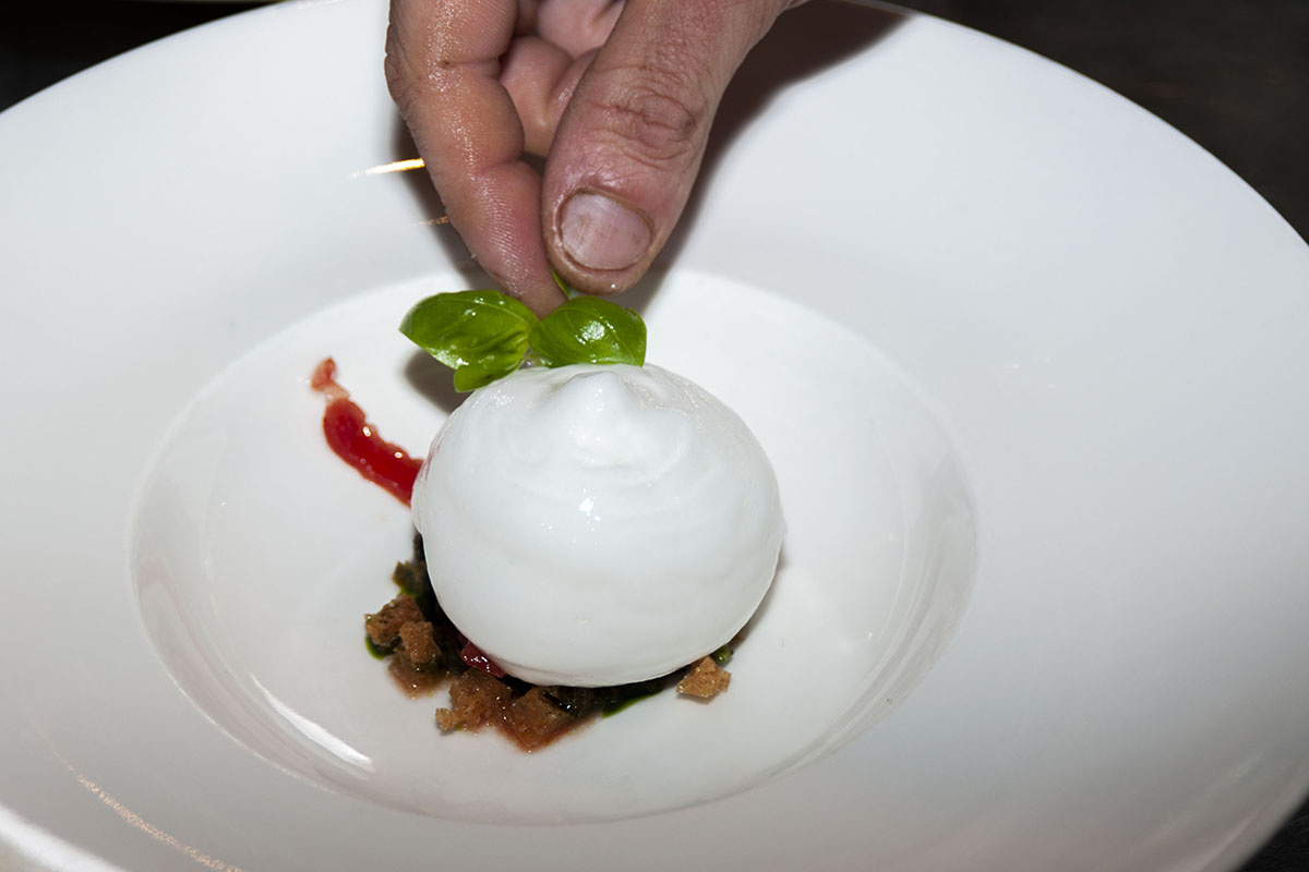 “Oggi reinterpreto la caprese, un piatto semplice ma proposto ad una clientela esigente ed amante dei sapori semplici, quale quella di Ginevra. Questa proposta nasce due anni fa come amuse – bouche ma diventa un vero e proprio piatto, più tardi. Si presenta come una sfera di mozzarella ma la sorpresa è all’interno. C’è il pane, i pomodori con la buccia, i classici componenti di questa ricetta ma proposti in varie consistenze, per una proposta insolita da quella che immaginiamo comunemente.” – Sbaragli spiega così il suo piatto.
