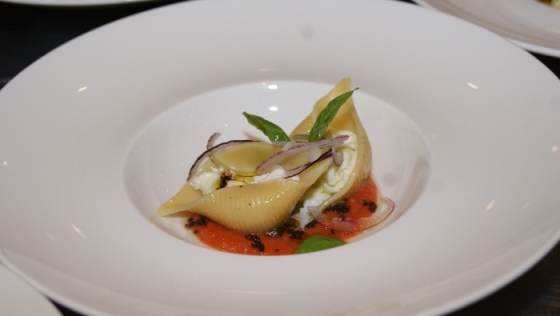 Pasta fredda, nello specifico Conchiglie del Pastificio dei Campi, cotta in brodo vegetale con cipolla, capperi salati, origano, acqua dei pomodori del piennolo. La salsa di pomodoro è ottenuta frullando i pomodorini in naturalezza. La mozzarella di bufala campana Dop viene stracciata a mano ed inserita a crudo nelle conchiglie condite con olio di olive taggiasche, olio extravergine e pepe. Il piatto viene chiuso con cipolla rossa a crudo, olive taggiasche essiccate ed emulsione di aceto balsamico. La chef, premiata dal Gambero Rosso come Giovane dell’anno, tende a spingere molto sui toni acidi degli ingredienti.