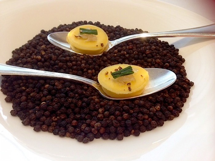 Ne è un bellissimo esempio il tortello di bufala, che parte dall’idea di base del cacio e pepe romano ma la rivisita utilizzando la mozzarella di bufala e diversi pepi aromatici. “La mozzarella è un prodotto difficile da usare a caldo – spiega lo chef – perché tende a strappare, quindi abbiamo lavorato molto sul siero di governo e sul latte di bufala”. Proprio questi due ingredienti, in proporzione fifty-fifty, sono alla base di un’emulsione a cui poi aggiunge della mozzarella fresca, appena asciugata, tagliata a pezzetti. Il tutto viene lavorato ancora a 60º, temperatura limite per la mozzarella, e addensato con della colla di pesce, poi colato negli stampini. Si ottiene così una “farcia” per la sottilissima sfoglia all’uovo che è un vero e proprio concentrato di mozzarella, a cui una velocissima cottura in acqua ridona la consistenza cremosa e avvolgente della bufala. Il “tortello” così ottenuto viene servito su di un cucchiaio (in un piatto per due, all’insegna della convivialità) su un letto profumato di pepi aromatici (Sarawak dalla Malesia e Pondicherry dall’India) e con in cima degli agretti e un pezzetto di cipolla caramellata. Un boccone unico, e indimenticabile.