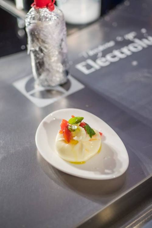 Poi “fila” davanti al pubblico dei bocconcini che farcisce con yogurt e panna di bufala, appena conditi con olio extravergine e pomodori a dadini. Al primo morso, esplodono in tutta la loro golosa ricchezza ricordando il piacere istintivo dell’addentare una mozzarella sporcando se stessi e chi è vicino con il suo latte.