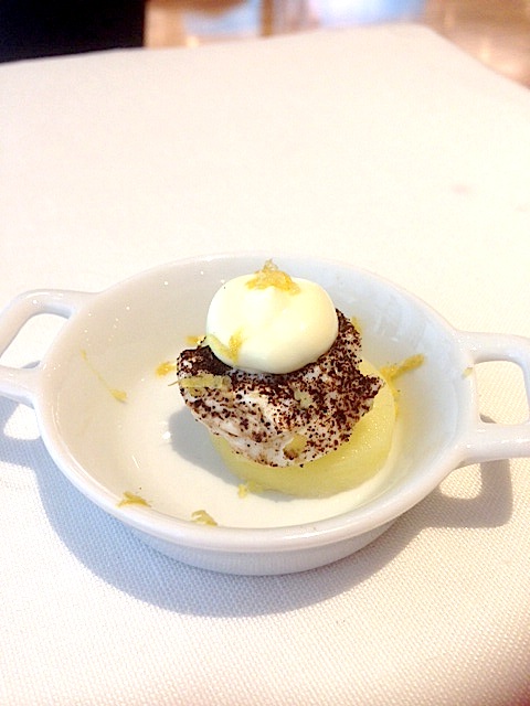 Ricorda invece una golosa merenda pomeridiana il “bon bon” di bufala e patate dove si incontrano Friuli e Campania: la patata di Godia fa da base a un pezzetto di mozzarella di bufala passato nella polvere di caffé (non ne sono forse le due capitali, Napoli e Trieste?), accompagnate da una maionese senza uovo, emulsione perfetta di latte di bufala e olio extravergine, e dalla zest dei profumati limoni della Costiera. A proposito di quando dicevamo all’inizio, il nome di questo piatto – nato da un sondaggio su Facebook e approvato da Scarello – è Anche alla bufala piace la patata…