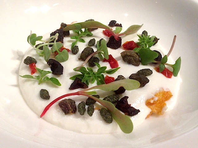 Si parte dal Muesli di nuance mediterranee con crema di ricotta, una “colazione” (oggi proposta come benvenuto al ristorante) a base di una zuppa di ricotta cotta a 60 gradi con un po’ di latte di bufala, accompagnata dai sapori mediterranei per eccellenza, in versione croccante: olive di Gaeta, capperi, pomodori secchi, orzo (rimando alla tradizione friulana, questo) all’origano, basilico e santoreggia essiccato e fritto. Non poteva mancare l’extravergine, anch’esso reso croccante grazie al tramite dei corn flakes che ne assorbono il sapore senza perdere consistenza.