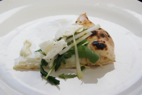 La maratona di pizza a Le strade della mozzarella continua con Franco Pepe, pizzaiolo di Caiazzo, che propone una pizza cotta in forno con mozzarella di bufala.