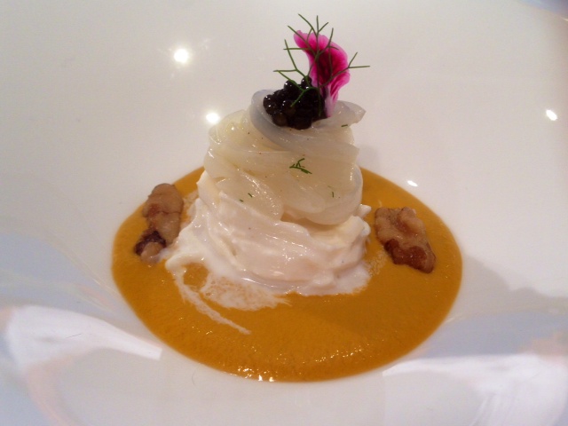 Eleonora Cozzella, che lo presenta sul palco, ne ricorda delle parole significative: “i cuochi non dovrebbero mai dimenticarsi di ricordare”. E proprio al valore dei ricordi familiari e territoriali, e all’importanza dei prodotti “dimenticati”, sembra rimandare il primo dei piatti che presenta, un antipasto – messo a punto con il souschef Giuseppe D’Amato – dove nuovamente si incontrano mozzarella di bufala e seppia. In questo caso però entrambe rimangono crude, cercando un gioco di consistenze e masticabilità invece della completa fusione di texture. La seppia viene messa nel piatto sotto forma di “tagliatelle”: una forchettata messa sopra alla mozzarella, entrambe poggiate su un fondo di salsa – quasi un gazpacho – a base di pomodori centrifugati con olio extravergine, carote, sedano e limone. Un piatto non replicabile almeno per il momento, perché i pomodori usati erano gli ultimi superstiti dell’orto della mamma, i pomodori invernali che rimangono sulla pianta non giungendo mai a maturazione, mantenendo un colore ocra, una buccia spessa e un sapore tutto particolare. A finire, come vezzo ben gradito, un cucchiaino di caviale.