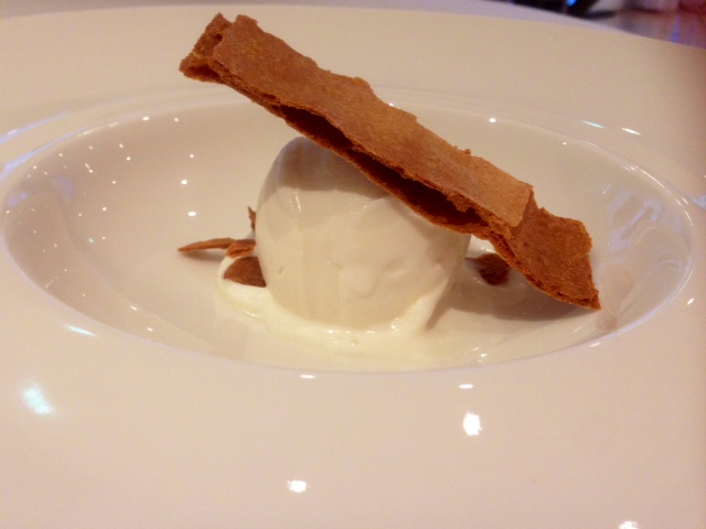 Gennaro – e il suo pasticcere Daniele – giocano con la mozzarella di bufala anche per il dolce. Un gelato di latte di bufala accompagnato da una sottile lamina di pasta sfoglia, che nasconde il vero segreto: al posto del burro, la materia grassa è costituita dall’”estrazione” del grasso di una treccia di mozzarella, frullata, passata al setaccioe poi lasciata in frigo diverse ore fino a ottenere un panetto consistente: questo “burro di mozzarella” regala alla sfoglia una friabilità particolare, meno grassi e colesterolo e un sapore del tutto peculiare.