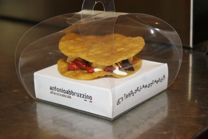 Nell’atelier Pasta, mozzarella e bufala presenta un piatto semplice, come possono essere le linguine con vongole e cozze, rivisitandolo in base alla propria esperienza. La pasta condita con i frutti di mare viene stracotta, frullata, impastata fino a diventare cialda, che viene tagliata in dischetti e fritta. Questa è la base del condimento, costituito da concentrato di pomodoro, basilico, pomodorini confit, mozzarella, limone, salsa di burrata con colatura di alici ed alghe liofilizzate. Il tutto viene poi inserito in una confezione particolare realizzata per l’occasione.