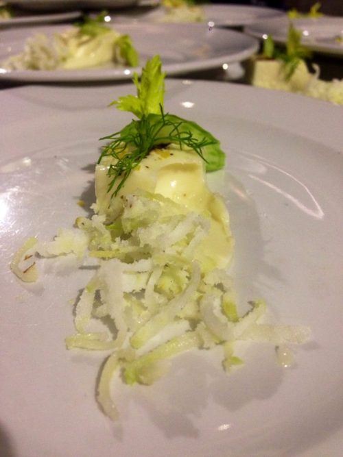 Seconda tappa: Ivoire, una cagliata di cioccolato bianco fatto con caglio vegetale (ottenuto con un concentrato di ortaggi come sedano, finocchio o cardo) senza zuccheri aggiunti, servito con un centrifugato di mela, sedano e finocchio e una granita di mela Granny smith. La freschezza dove non ce la si aspetterebbe.
