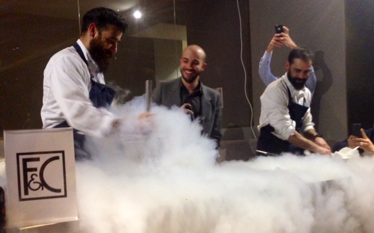 Si parte con il Riso croccante, zucca e nocciole: riso in doppia consistenza (una polentina morbida e il riso crunch realizzato appositamente per loro), granella di nocciole e crema di zucca aromatizzata con buccia d’arancio e il suo olio essenziale. A finire, il gelato di nocciola fatto con l’azoto liquido e l’immancabile scaglia di sale. Un gioco di temperature e consistenze il cui scopo è quello di «creare in bocca un bordello».