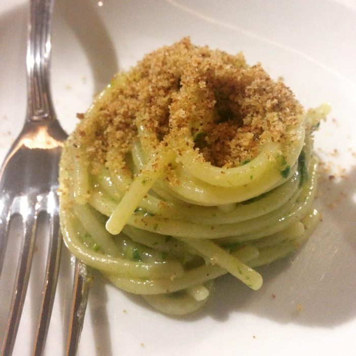È quasi un grand tour d’Italia questo piatto in cui gli spaghetti di Gragnano – una nuova selezione del Pastificio – vengono cotti nell’acqua delle cime di rapa, poi spadellati (e non risottati!) con diversi cavoli e brassicaee come il marasciuolo (broccolo selvatico pugliese) e infine insaporiti con un po’ di crema di nocciole (ottenuta tostando e frullando le nocciole piemontesi con acqua), un po’ di crema al tartufo e pochissima colatura di alici di Cetara; a finire, un filo d’extravergine pugliese di Peranzana, dal profilo intenso e deciso. Nel piatto, Alessandro non ha timore di lasciare la verdura in pezzi ben visibili: «Basta con queste salse quasi impalpabili, basta estrazioni e concentrazioni. La pasta va portata nell’alta ristorazione ma senza perdere la sua essenza di piatto popolare».