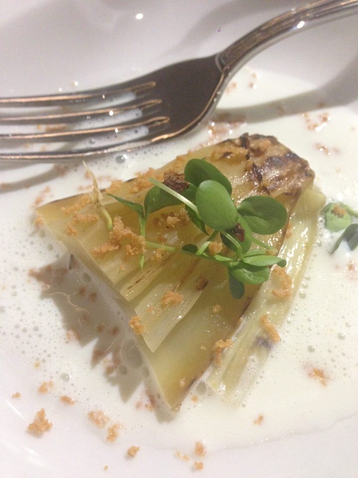 Arriva poi Invidia: gioco di parole che parte proprio da una foglia di indivia belga, servita come “contenitore” di un susseguirsi di sensazioni e sapori che procede in base al verso in cui si mangia la portata: per metà nettamente liquirizia (in crema) e per metà nettamente mandorla (sia in crema, ottenuta frullando le mandorle con dell’acqua frizzante a velocità, sia in granita ottenuta con l’azoto liquido, ad annullare il gusto amarognolo dell’indivia). Nel mezzo, veloci guizzi di limone (in scorza, a dare acidità) e polvere di capperi per dare sapidità.