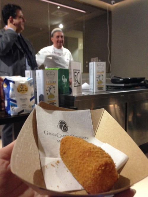 Da quel momento, Pasquale non ha messo di studiare per ottenere il fritto migliore, gustoso e non unto. E pure sano visto che, se ben fatta, la frittura serve anche a mantenere intatte le proprietà nutrizionali degli alimenti, protetti dalla pastella. Da poco ha trovato un alleato in Olitalia, con cui ha messo a punto Frienn, un prodotto pensato apposta per fare una buona frittura nella ristorazione (ma a breve anche per casa): un olio di girasole altoleico addizionato con olio essenziale di rosmarino, un antiossidante naturale che aumenta la stabilità e la “tenuta” dell’olio da frittura, contro l’invasione dell’olio di palma. Il risultato è un fritto estremamente asciutto e non untuoso, come hanno dimostrato i due assaggi proposti a Milano: prima il supplì al telefono, che ha bisogno di due cotture per ottenere la perfetta “filatura” del formaggio che accompagna il ragù napoletano nel condimento, e una panatura croccante. Un dettaglio, quest’ultimo, che come spiega Pasquale cambia da città a città: a Roma piace più grossa, a Firenze più fina. Per dire che a lui, la filosofia glocal dei grandi fast food gli fa un baffo.