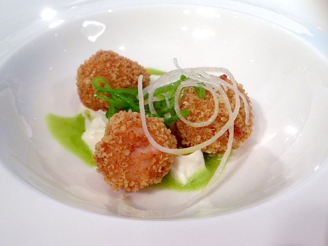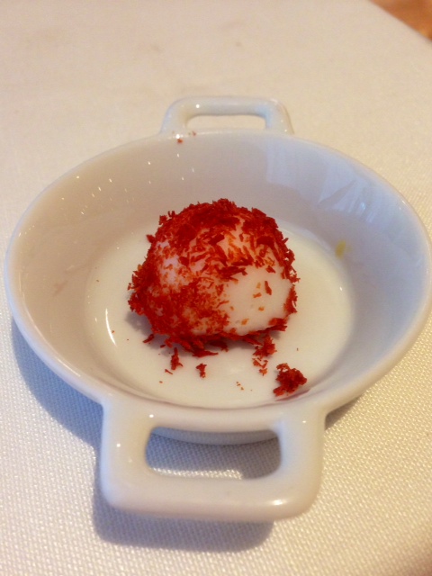 Si va dal “marshmallow” di bufala (a base di acqua di mozzarella estratta dalla bufala, frullata e setacciata poi addensata con colla di pesce) congelato e passato nel pomodoro liofilizzato, che ripropone un abbinamento classico con texture inedite, alla polpetta “Momotaro” – ispirata all’omonima favola giapponese e gia’ proposta al Clandestino nel “menu delle fiabe” del 2012 – in cui seppia e mozzarella (la cui combinazione Cedroni aveva già proposto in una passata edizione del congresso, avendo scoperto che l’albumina presente in entrambe si combina alla perfezione) vengono frullate e ricomposte in una sorta di polpetta congelata ricoperta di miglio, che una volta fritta diventa liquida all’interno e crocante all’esterno. La polpetta viene servita con una salsa di mandorle appena dolce, una salsa di friggitello leggermente piccante, pesche (che rimandano alla fiaba di origine), daikon e friggitelli crudi a dare croccantezza e salsa di soia e mirin per l’acidità, in un “boccone” esplosivo. Ancora seppia e bufala insieme nella versione rivista e corretta ad hoc del famoso “bounty” di cocco e seppia glassati al cioccolato a cui si aggiunge anche la mozzarella. Infine, il saluto dolce dello chef con la ricotta di bufala accostata semplicemente con la sua confettura di fragole e timo.
