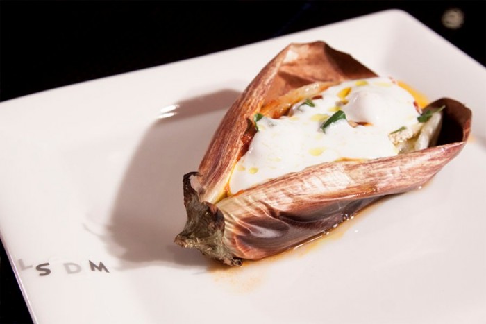 Il piatto presentato nella sala Pasta, mozzarella e pummarola è una melanzana con pasta, pomodoro e mozzarella. Da Vittoria, in Sicilia, recupera la melanzana striata, zebrata, la mette in forno intera ad altissima temperatura, la fa gonfiare, annerire fin quando la pelle si scolla dalla polpa, che risulta bianca all’interno. Incide la melanzana che diventa una sorta di contenitore, dove inserisce colatura di alici, pasta al pomodoro, crema di mozzarella ottenuta passandola fredda al mixer e olio.