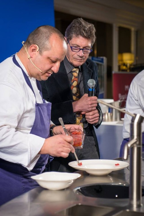 Ancora Sicilia, quella più autentica e rustica, con Ciccio Sultano. Lo chef di Ragusa, uno dei protagonisti della svolta della ristorazione siciliana come ricorda Luigi Cremona, dichiara il suo amore per la campagna tanto che ha pure messo su una piccola azienda avicola dove alleva polli e galline. Al congresso porta un carciofo “spinello” cotto sui tralci di vite secondo l’usanza siciliana, che ricorda da vicino quella delle furnacelle campane. Quasi bruciato nelle foglie esterne, poi eliminate, viene farcito al cuore con dei dadini di mozzarella e poi passato brevemente al forno. Nel piatto, sistema una rondella di bufala tal quale con delle briciole di pane abbruscato con del finocchietto selvatico a ricordare la brace, sui cui sistema il carciofo a testa in giù. A questo punto vi versa del brodo di pollo con del Marsala – alla maniera siciliana – e finisce con una generosa dose di tartufo bianchetto siciliano a scaglie e con pomodori ciliegino e peperoncini canditi. Un piatto intenso, corroborante e pieno di suggestioni, come tutti quelli di Sultano.