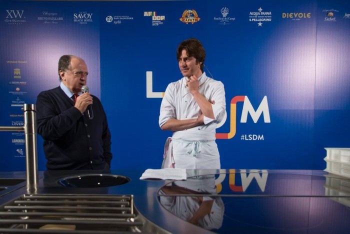 Tocca poi a Giuliano Baldessari, chef-patron dell’Aqua Crua di Barbarano Vicentino. Emozionato, spiega che lui è un cuoco e parlare in pubblico non gli riesce: una frase quasi insolita ormai, che ci riporta con piacere all’essenza del lavoro di chi sta in cucina. Ma non solo: Baldessari – amico e allievo di Massimiliano Alajmo, con trascorsi in cucina anche da Aimo Moroni e da Marc Veyrat – dimostra di saper trovare ispirazione in tutto ciò che lo circonda, dall’arte alla natura. Il primo assaggio, realmente essenziale – un bocconcino di mozzarella – serve a introdurre il ragionamento sul potere dell’illusione che, cita, è la “distorsione di una percezione sensoriale causata dal modo in cui il cervello interpreta le informazioni che riceve”; un po’ come avviene nei quadri di Escher dove uno stesso soggetto, ripetuto all’infinito, dà luogo a una visione complessa e differenziata. Dunque il secondo “bocconcino” è in realtà una sfera di “mozzarella home-made” che nasconde una sorpresa, con tanto di presentazione a effetto con un mirascopio, specchio illusorio che riflette all’esterno quel che contiene all’interno. Il latte di bufala viene lavorato a 37°, cagliato con fermenti e poi “filato” esattamente come una mozzarella, al cui centro viene inserita una pasticca congelata di estratto di pomodoro, poi chiuso e mozzato. L’aspetto è uguale al bocconcino precedente ma l’assaggio si rivela ben diverso da quello che la mente si aspetterebbe.