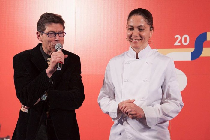 Dopo un video che racconta la storia del Don Alfonso dal 1890 e dell’azienda agricola Le Peracciole, Ernesto Iaccarino sale sul palco con Guido Barendson per presentare un sufflè di mozzarella, accompagnato da spaghetto soffiato, neve di mozzarella, pomodoro, emulsione di basilico ed una spolverata di origano, ingredienti classici in varie consistenze abbinati ad un cuore caldo.