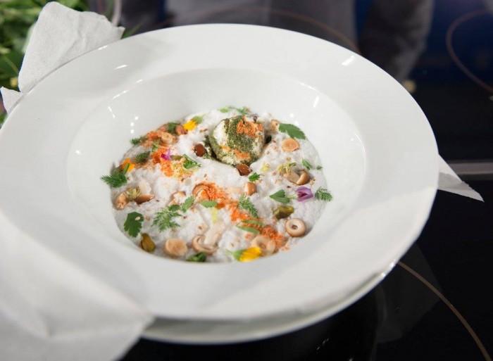 E allora, dice Tassa, perché non far tornare la mozzarella da dove viene, nel ventre della bufala rispettando la naturalità dell’ingrediente? Lui lo fa attraverso l’importanza del gesto, a margine di una preparazione lunga e laboriosa: prendendo spunto da tecniche giapponesi ottiene una sorta di crema di latte e siero di mozzarella in cui sono state infuse erbe selvatiche e addensata con polvere di kuzu, a ricreare una sorta di “liquido amniotico”. La mozzarella da cui ha estratto il latte, ormai gommosa, viene disidratata per otterne una polvere che, reidratata e messa nel Pacojet, trasforma in palline di gelato di mozzarella rotolate in una polvere di erbe e sesamo.