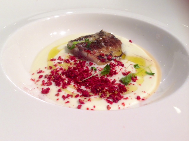 Il primo piatto che presenta ne è un ottimo esempio: la zuppa di ricotta di bufala con colatura di alici di Cetara, ricotta mustia affumicata (arrivata direttamente da Macomer) con lo sgombro “cotto” solo sulla pelle per dare la nota di bruciato, la polvere di lamponi disidratati e la “sorpresa” acida del rabarbaro sotto a tutto, è un sorprendente lampo di genio e freschezza a budget low cost.