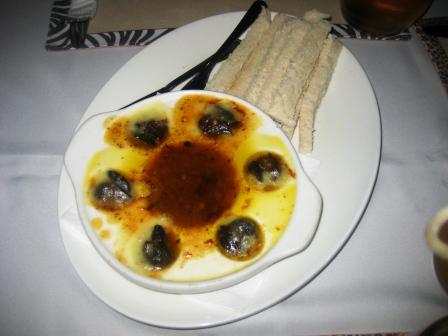 Qualcuno si dedica alla carne (me compreso), qualcun altro al pesce. Ovviamente filetto e T-bone dominano il menù, ma anche spare ribs (tracchie) e agnello. Prendiamo anche degli antipasti: gamberetti stufati, onion rings e anche lumache, squisite.