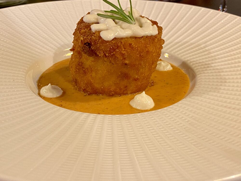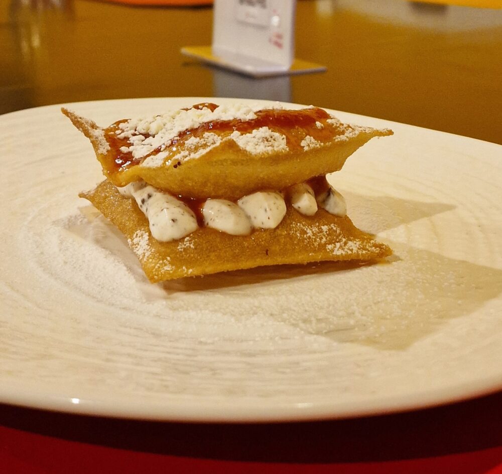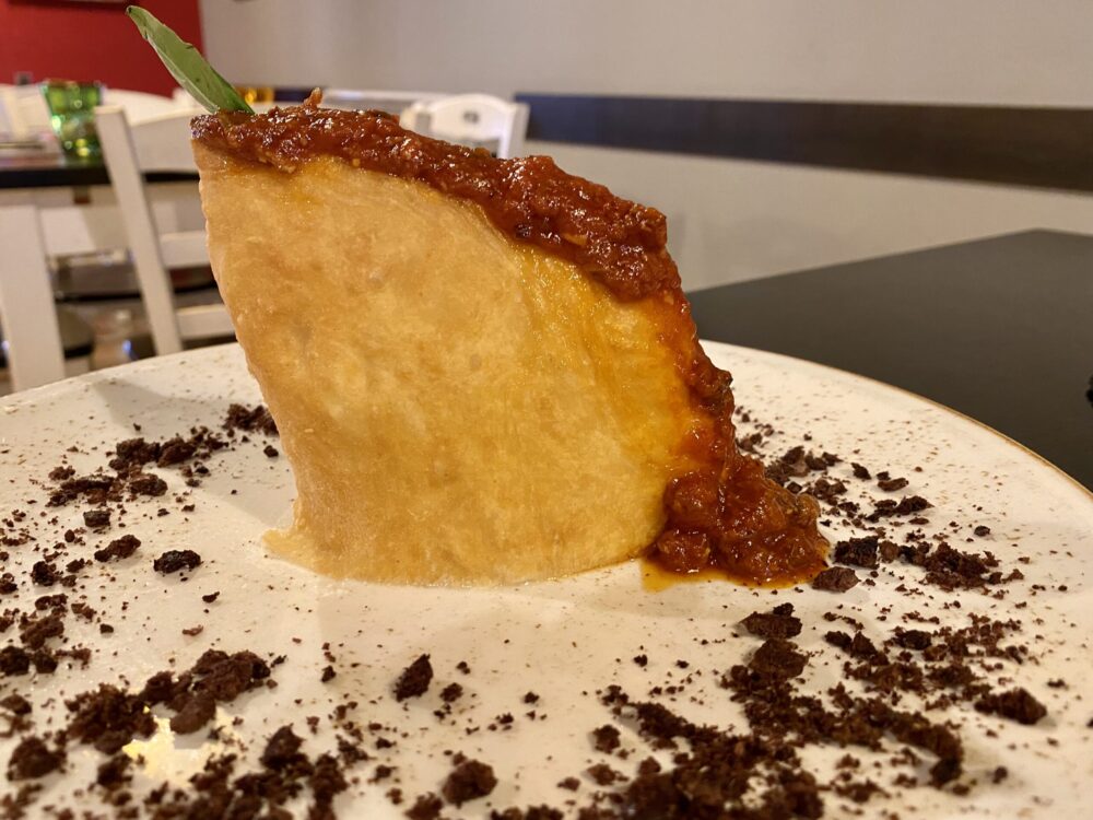 Poi, il “signature” di Luigi: il Gran Cono “A vocca r’o Vesuvio “, il mezzo calzoncino dorato condito con olive nere disidratate del Vesuvio e il ragù classico napoletano, mentre il ripieno ə di ricotta di fuscella aromatizzata con pepe nero macinato al momento.