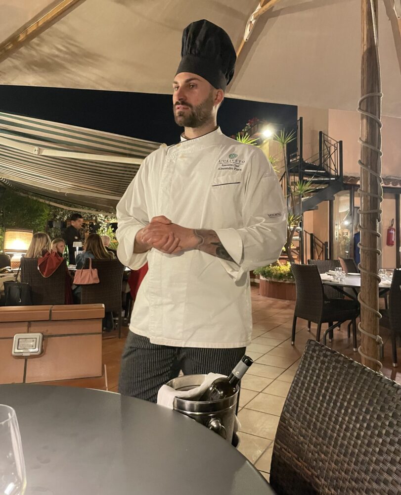Dal 2017 lo chef Alessandro Pica guida la cucina dell’Uliveto, una terrazza panoramica dallo splendido affaccio su Roma. Le sue prime esperienze lavorative le fa da Flavio al Velavevodetto a Testaccio per poi passare nel 2015 a Pro Loco Pinciano dove diventa sous chef. Qui incontra Arcangelo Dandini che lo coinvolge in varie esperienze sempre nella capitale, facendogli da mentore e sviluppando in lui la curiosità e la conoscenza dei prodotti del territorio romano e laziale che diventano un tratto distintivo della sua cucina. I suoi fornitori sono San Bartolomeo azienda in provincia di Viterbo che alleva polli ruspanti, Galline Felici azienda avicola a nord della capitale; molti prodotti della Rete Agricola HQF di Viterbo che fornisce tra le altre cose la carne di Marango, incrocio di fattrici di Maremmana e tori Angus allevati allo stato brado, o i carciofini sott’olio Agnone fatti in provincia di Latina. Di The Circle, azienda romana specializzata in acquaponica, sono tutte le insalate mentre i formaggi sono di DOL (D’Origine Laziale) o provengono da Fondi precisamente dalla casearia Casabianca. La cucina pesca molto nella tradizione romana ma tutto è visto in chiave attuale grazie a tecniche di cottura moderne che rendono tutto più leggero. I menù degustazione sono tre: Radici, Contrasti e Naturae(dedicato ai vegetariani).