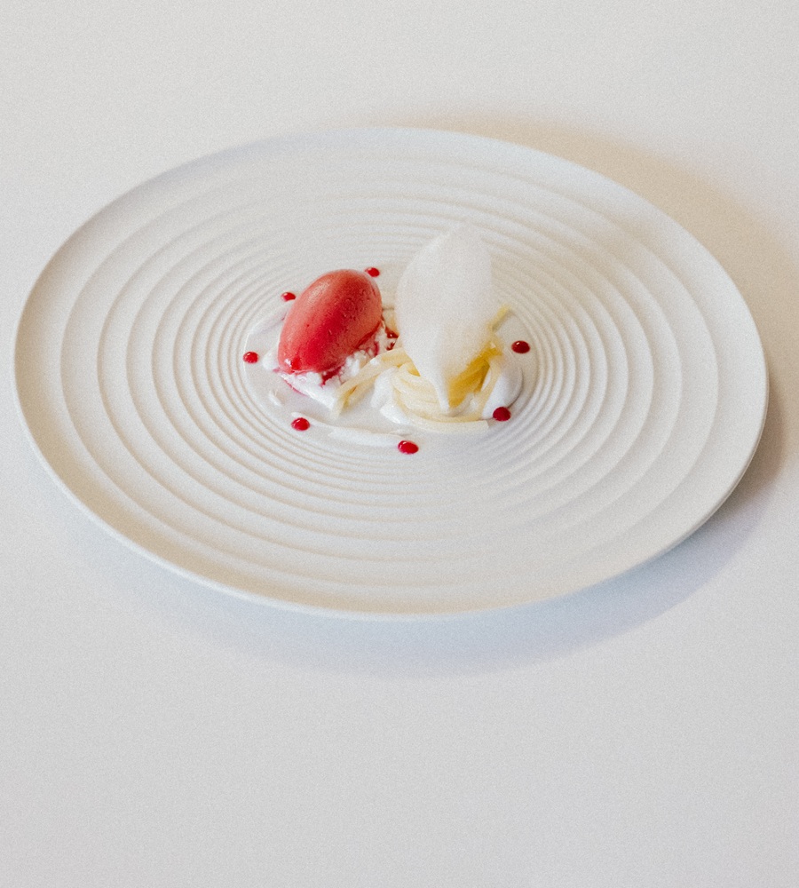 Realizzare un dressing con la meringa al centro del piatto contornandolo da puntini di gel di melograno. Sul lato destro del piatto disporre la ricotta di mandorle e adagiarvi sopra una quenelle di gelato di carote viola fermentate, mentre sul lato sinistro disporre la pasta. Ultimare con l’aggiunta della nuvola di zucchero filato.
