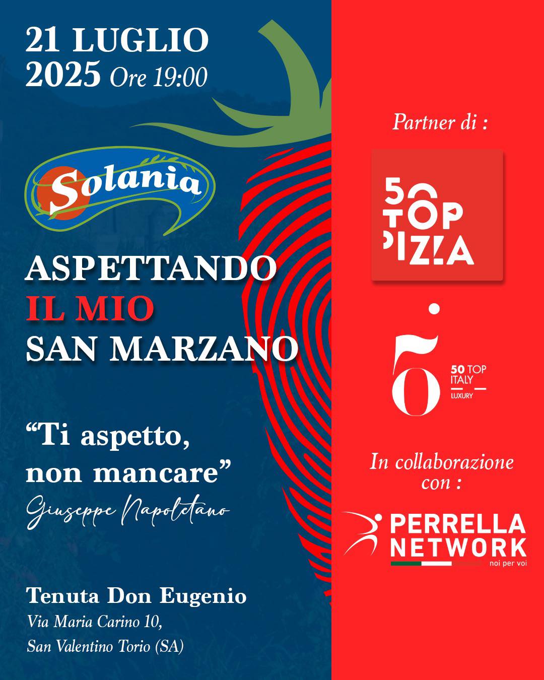 Lunedì alle 19 presso la Tenuta di Don Eugenio in via Maria Carino 10 di San Valentino Torio si svolge l’annuale evento «Aspettando il Mio San Marzano» organizzato dall’imprenditore Giuseppe Napoletano (nella foto con il figlio Davide) in partnership con Perrella Network. L’iniziativa è una grande festa nei campi che segna l’inizio della raccolta e vede pizzaioli, ristoratori, giornalisti, imprenditori, operatori del settore trascorrere insieme una giornata all’aperto.