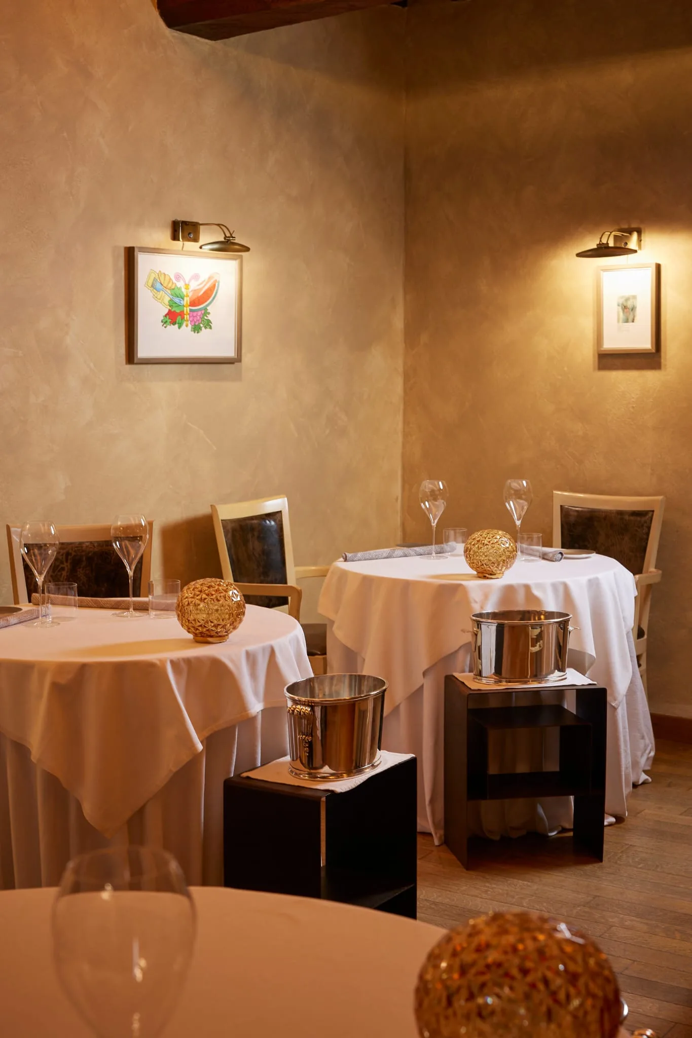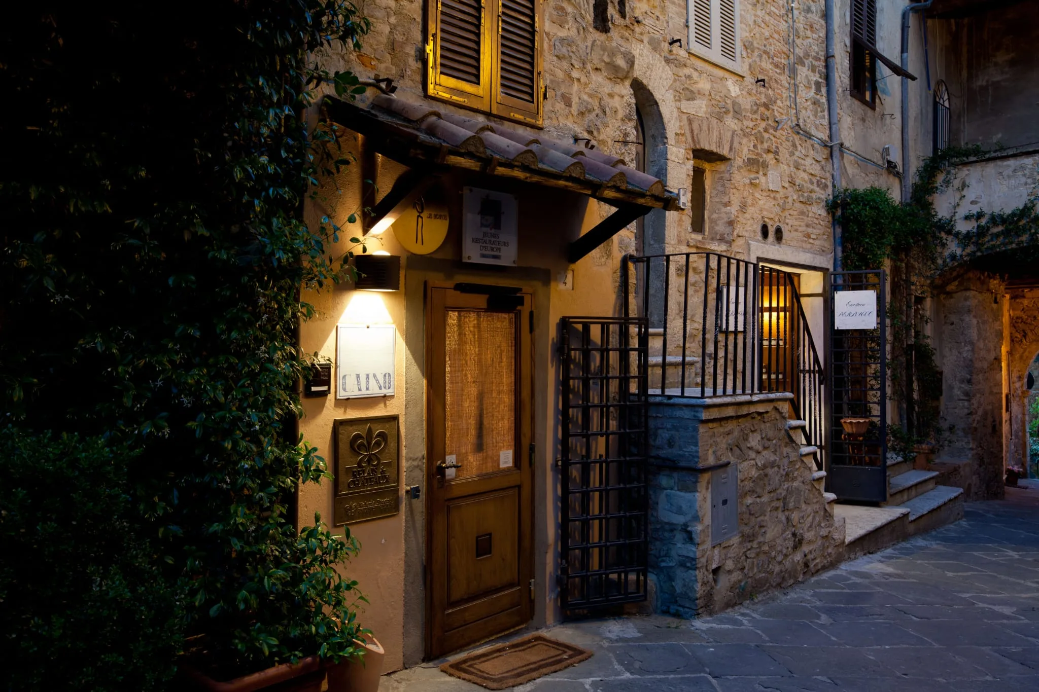 Le due sale, gestite con grande professionalità dal figlio Andrea (qui l’accoglienza è un fatto naturale dal 1971) che si occupa anche della monumentale cantina, contengono nove tavoli, mentre al piano superiore si trovano tre camere con arredi ottocenteschi, accanto il bistrot che in estate si trasferisce nella piazza del paese, Il Giardino, dove è possibile degustare la trippa di Nonna Angela che omaggia la suocera da cui tutto ha avuto inizio ed il panino con il lampredotto insieme ad altri piatti della tradizione più autentica.