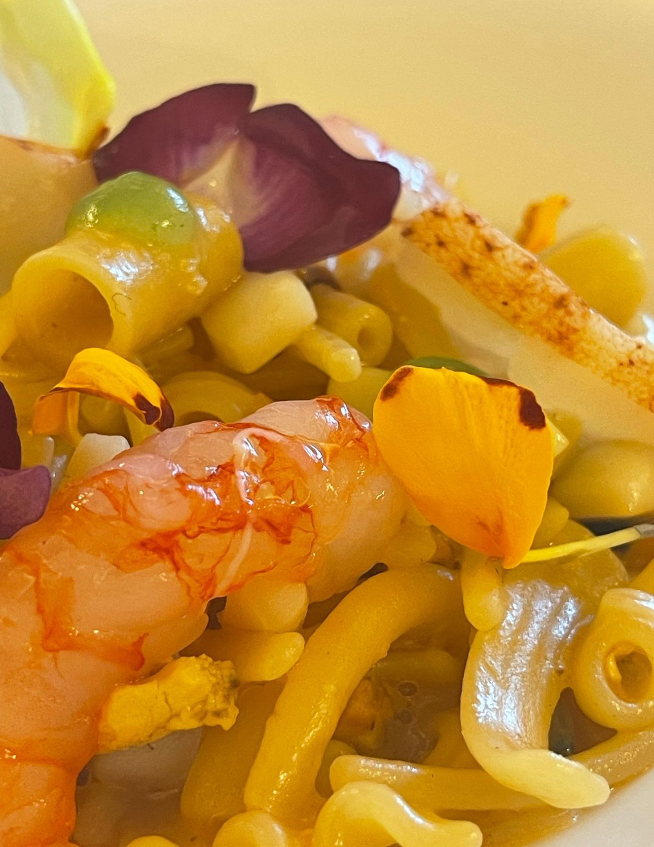 A seguire Pasta a…mare. Mischiato di pasta mista cotta in sette essenze di crostacei con anemoni marini e frutti di mare.