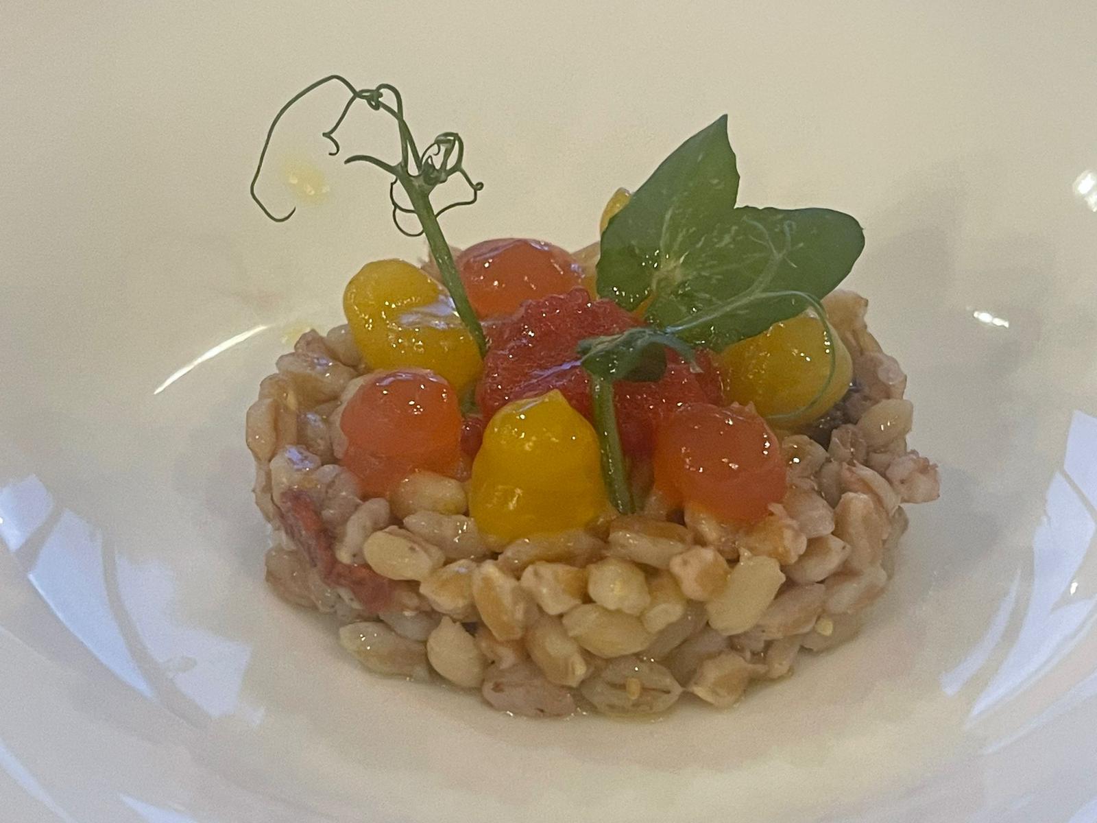 Si parte con la Satura pompeiana: insalatina di farro e orzo, bacche di goji, lampone, passion fruit e uova di pesce volante. È una personale interpretazione di chef Gramaglia della Satura, la zuppa di benvenuto che le matrone romane servivano agli ospiti con l’auspicio che il pasto saturasse (saziasse) i commensali.