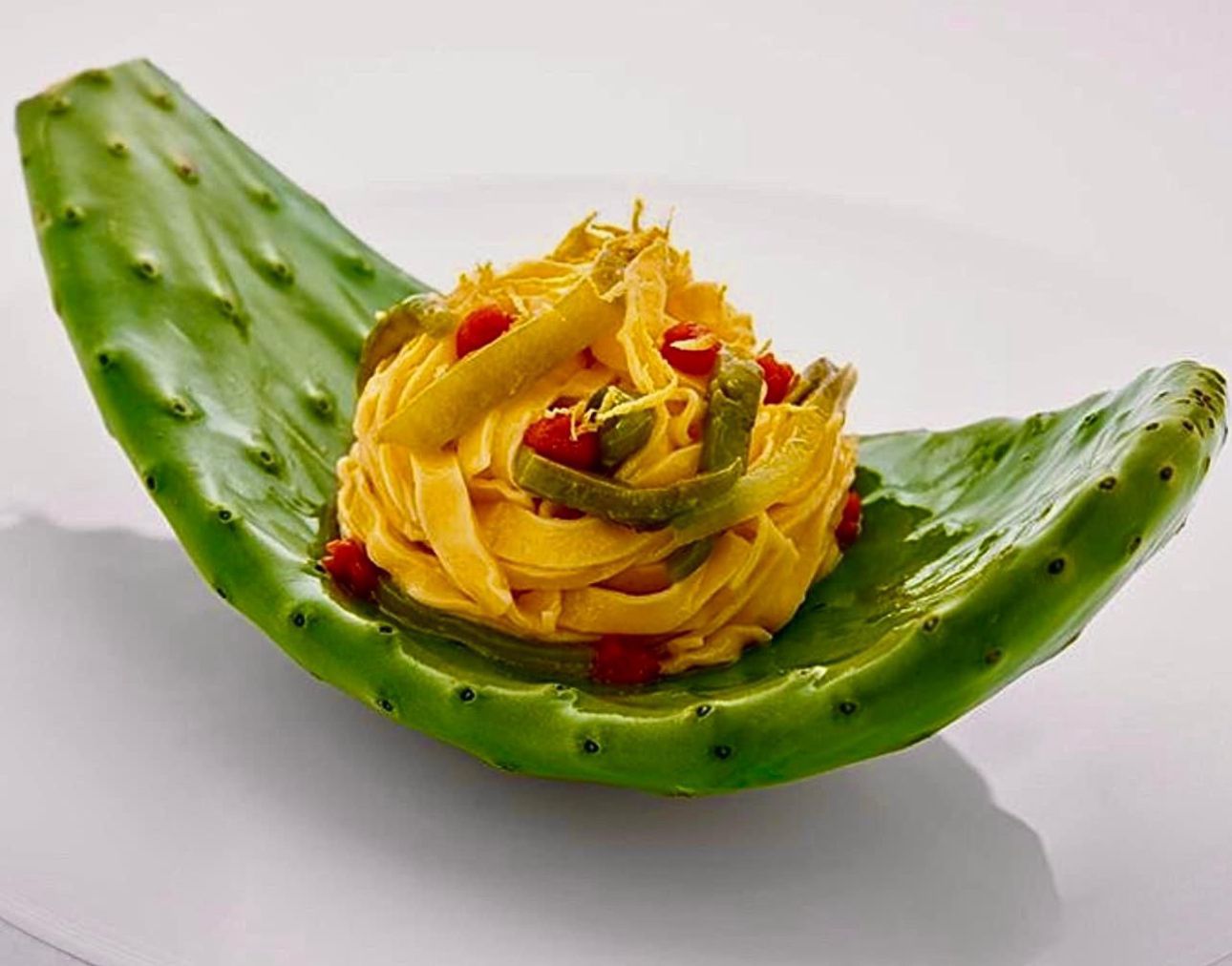 Omaggia l’estremo sud della Penisola, isole comprese, il Tagliolino aglio, olio, pala di fico d’india e ‘nduja. Delizioso il piatto da portata in finissima ceramica vietrese che riproduce la pala del fico d’India.