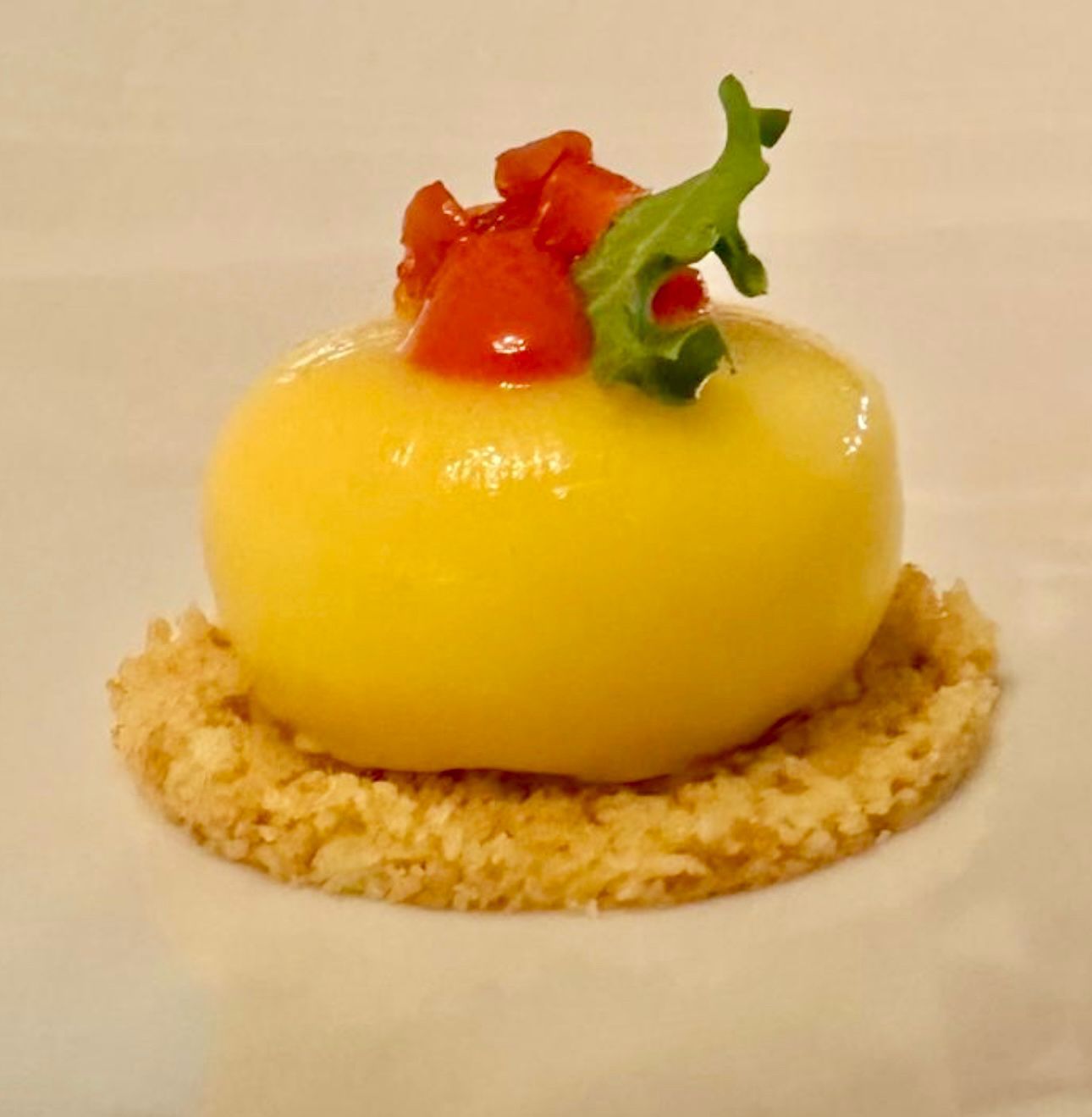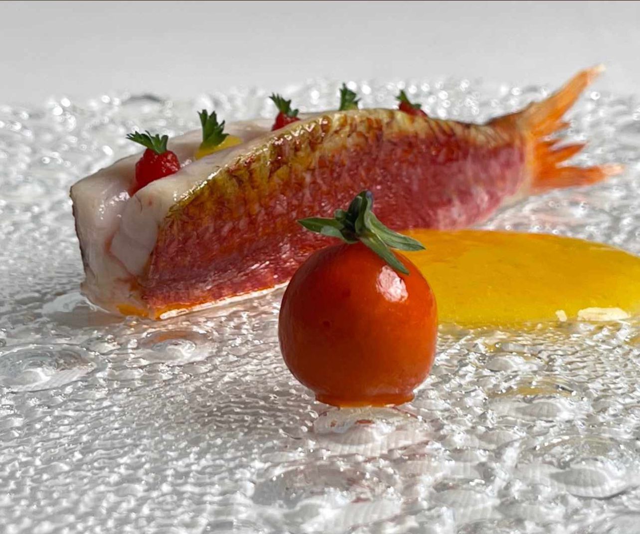 A seguire Triglia di scoglio in salsa bouillabaisse, limone candito e pomodorino di salsa marinara e il ritorno nella sua amata Campania con la sfera di baccalà e papacella napoletana.