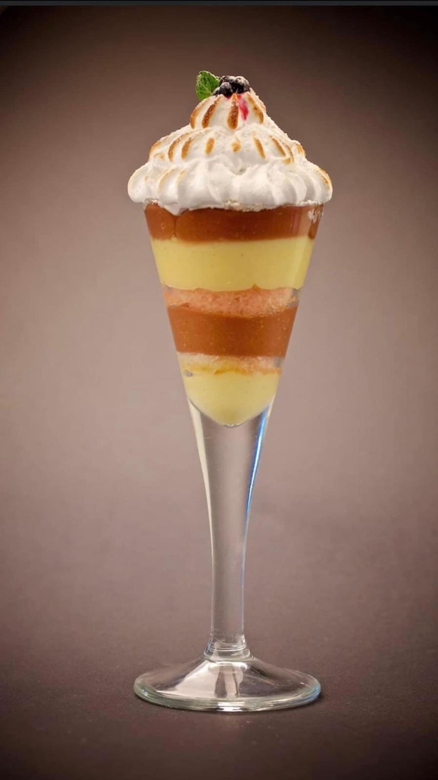 Per dessert la stratificazione di zuppa inglese chiusa da un’eterea cupola di meringa.