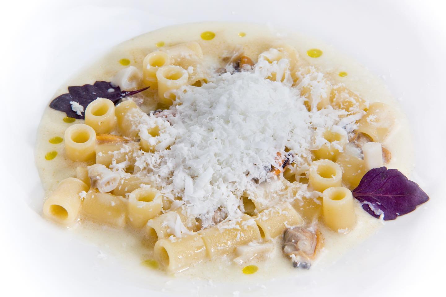 La rivoluzione (gentile) dei piatti che hanno fatto la storia della gastronomia italiana la ritroviamo anche nella Finta Carbonara: spaghettoni di Gragnano, crema di latte, zafferano e guanciale.