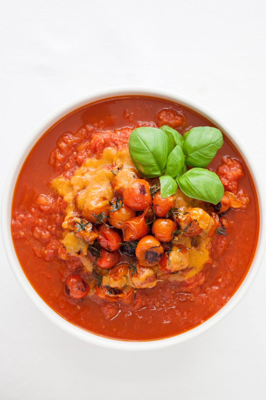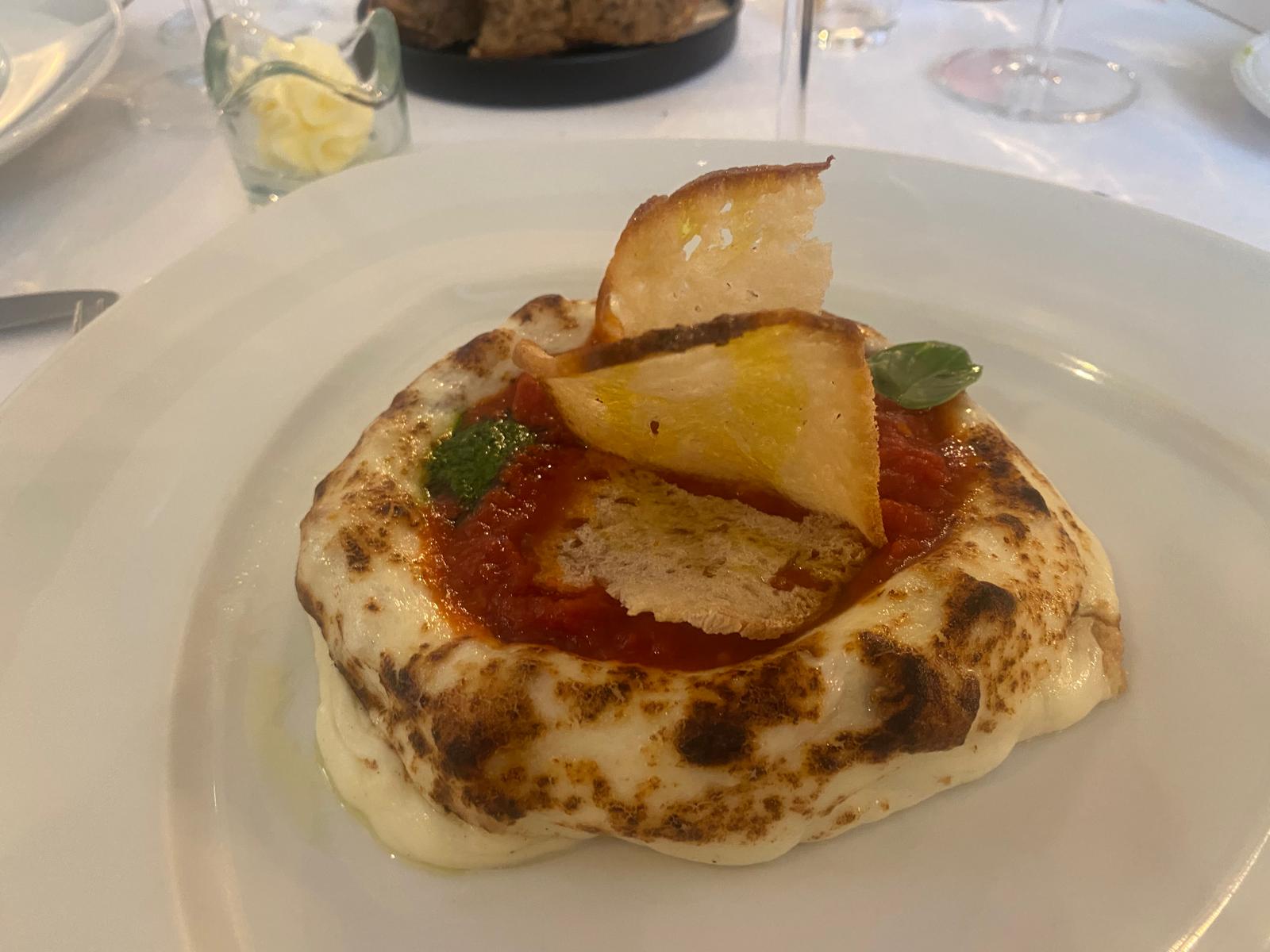 Straordinaria la Zuppa di pomodoro realizzata con cuore di bue, pachino e San Marzano con mozzarella, stracciata di bufala e tarallo napoletano.